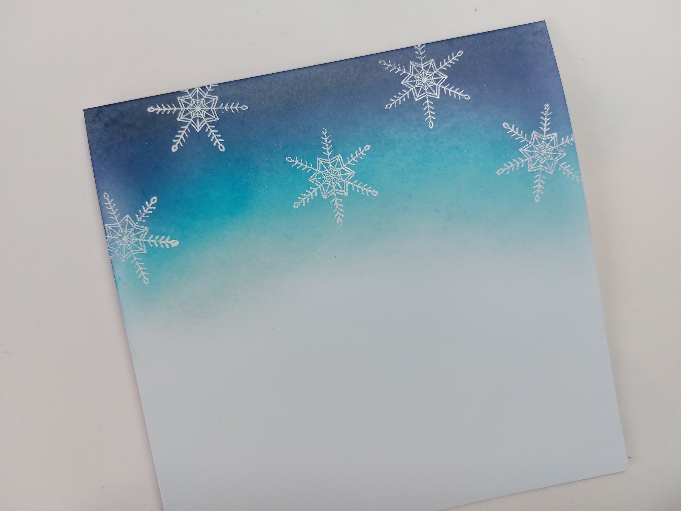 This time I started by blending ink onto a 6×6 card blank, starting from the fold side. I used ‘chipped sapphire’ at the edge, moving to ‘mermaid lagoon’ and then ‘speckled egg’. I added a little ‘black soot’ along the edge to just darken it a bit further.