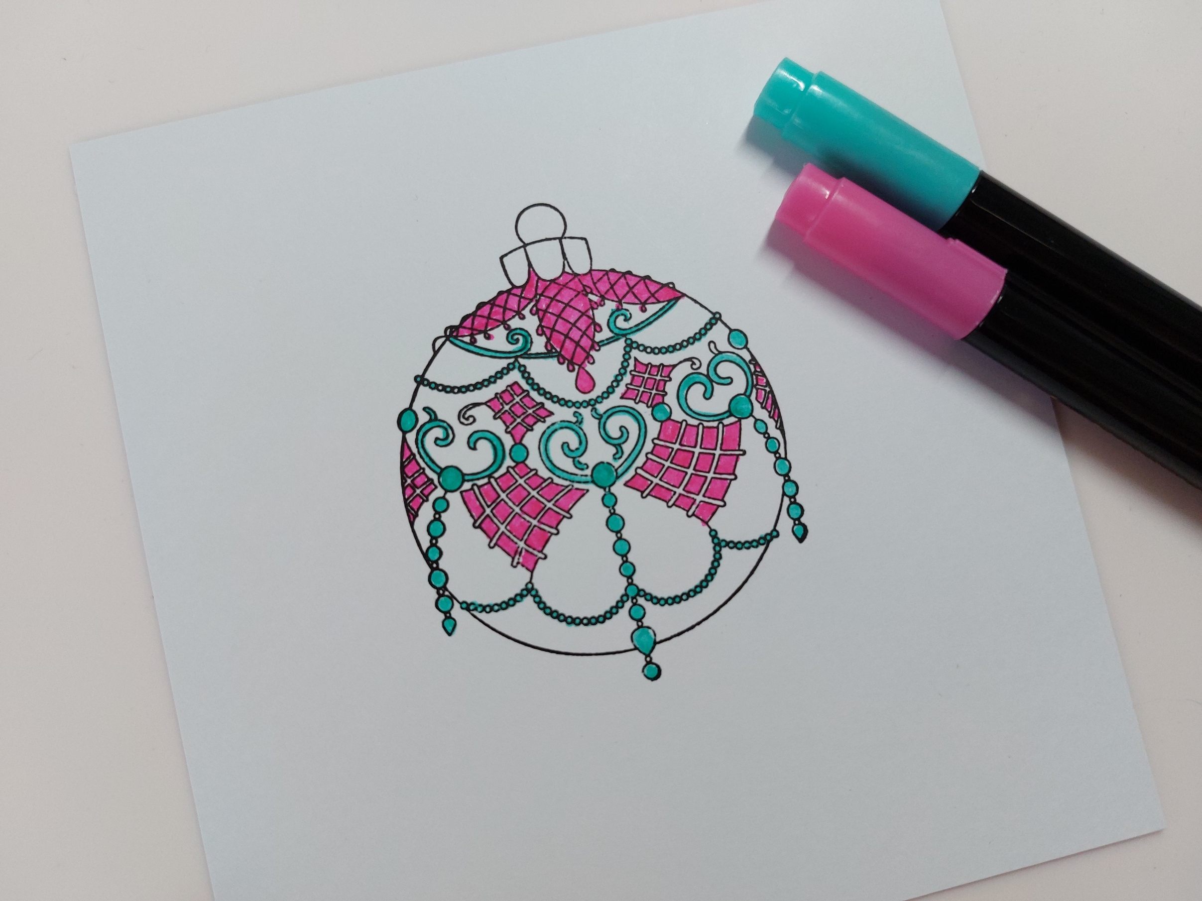 I started by stamping the bauble in the centre of a square of white card. You can see from this just how intricate the design is – which Barbara Gray drew herself in one of her SHAC (Stay Happy and Creative) shack online sessions. I wanted the bauble to really stand out as the focus, so opted to simply colour in the detailed pattern using Pergacolour pens.