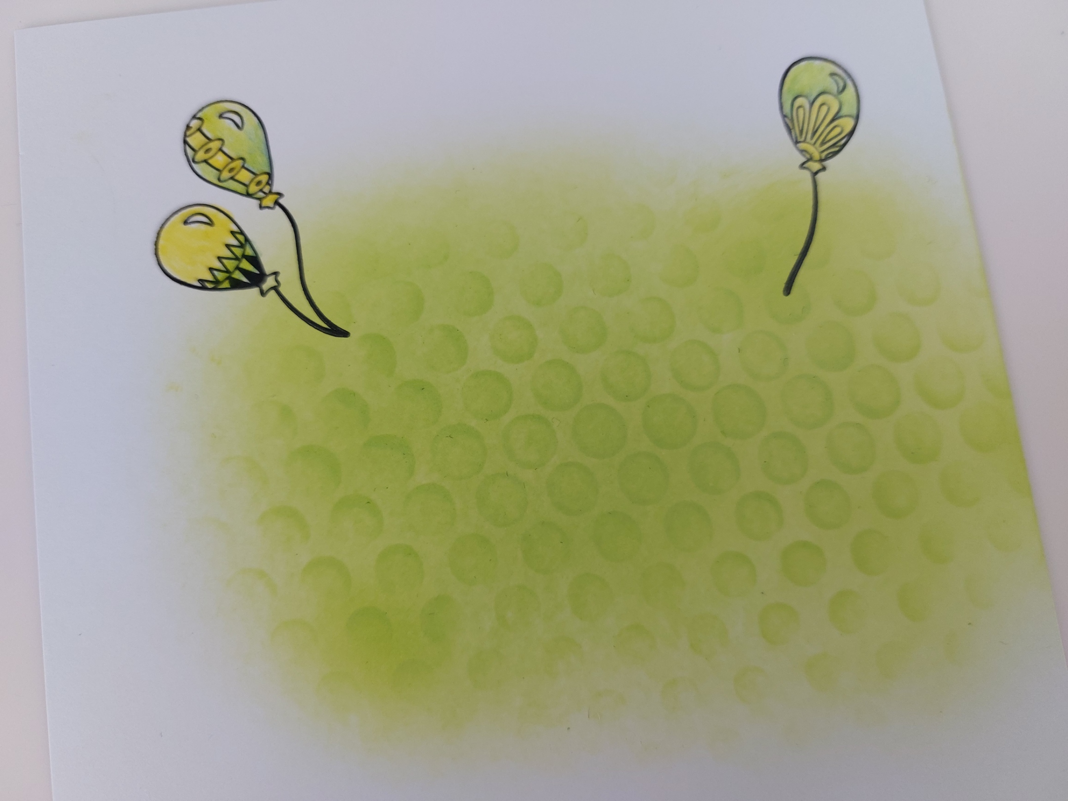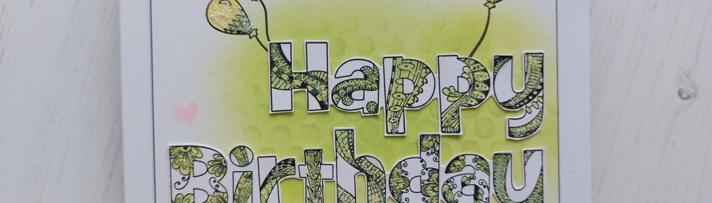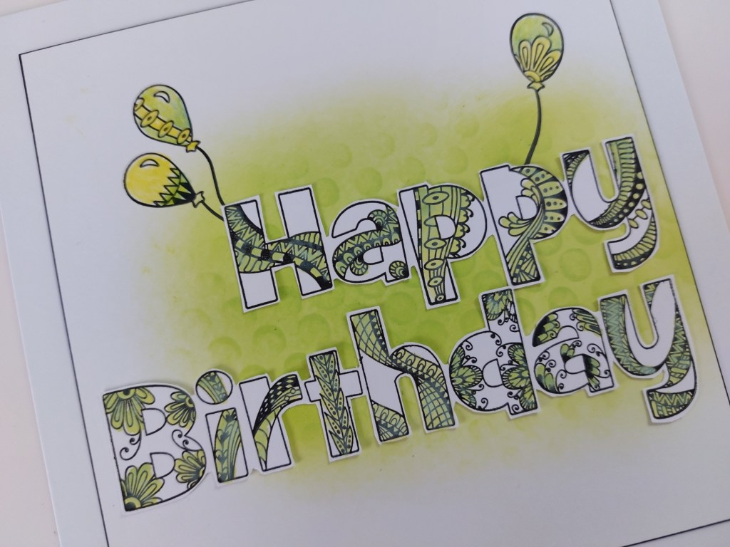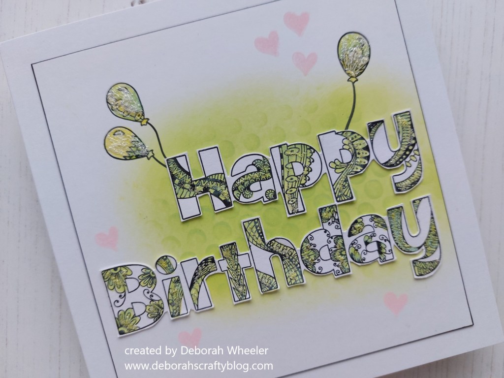 I started by stamping the words onto white card, then watercoloured the pattern on the letters with ‘twisted citron’ Distress Oxide and fussy cut them. I blended the ‘twisted citron’ onto a square of white card, adding a little detail with the ‘dotty wave’stencil, then stamped the balloons (making sure the strings would sit behind the words) and coloured them with yellow and green Pergaliner pencils.
