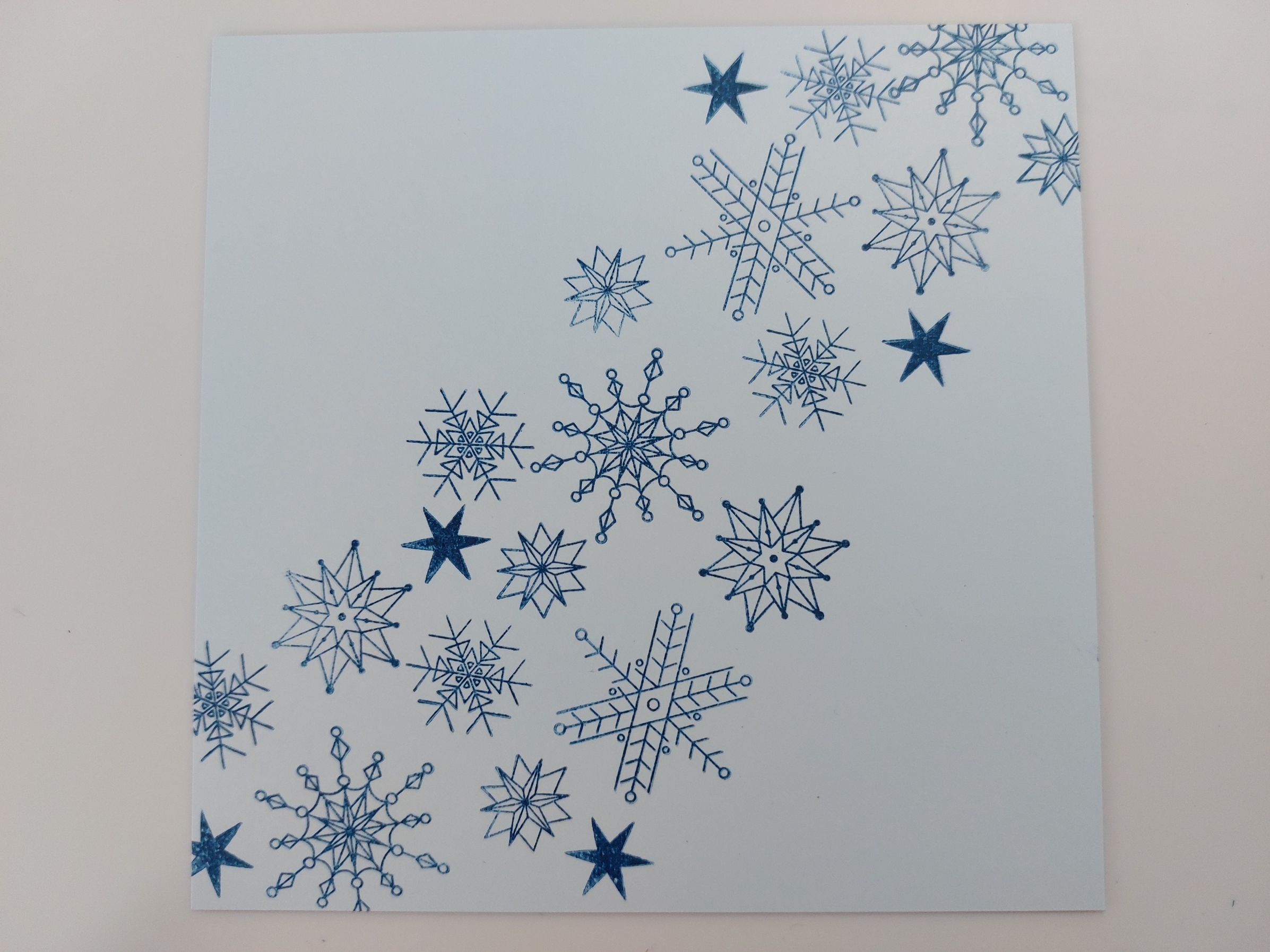 This is actually the last of my design team cards for the new SHAC Baubles stamp sets that ClarityCrafts launched last month and I realised I hadn’t shared it. There’s nothing too complicated about this one (my preferred style!) – I simply stamped the smaller snowflakes and stars from the two sets randomly on the diagonal across the card, using ‘chipped sapphire’ Distress Oxide.