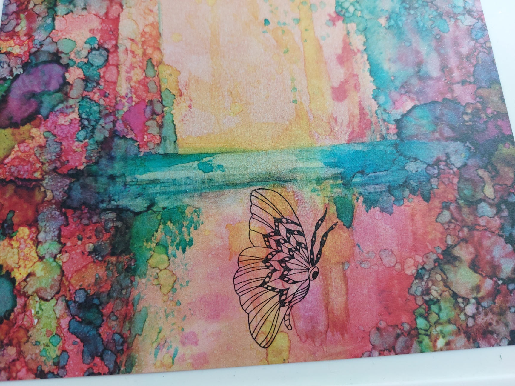 I stamped the butterfly ono a section of Waimea Falls paper which had the right tones, brought out the colours by adding shading with Pergaliner pencils, fussy cut it and attached it to the card.