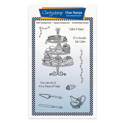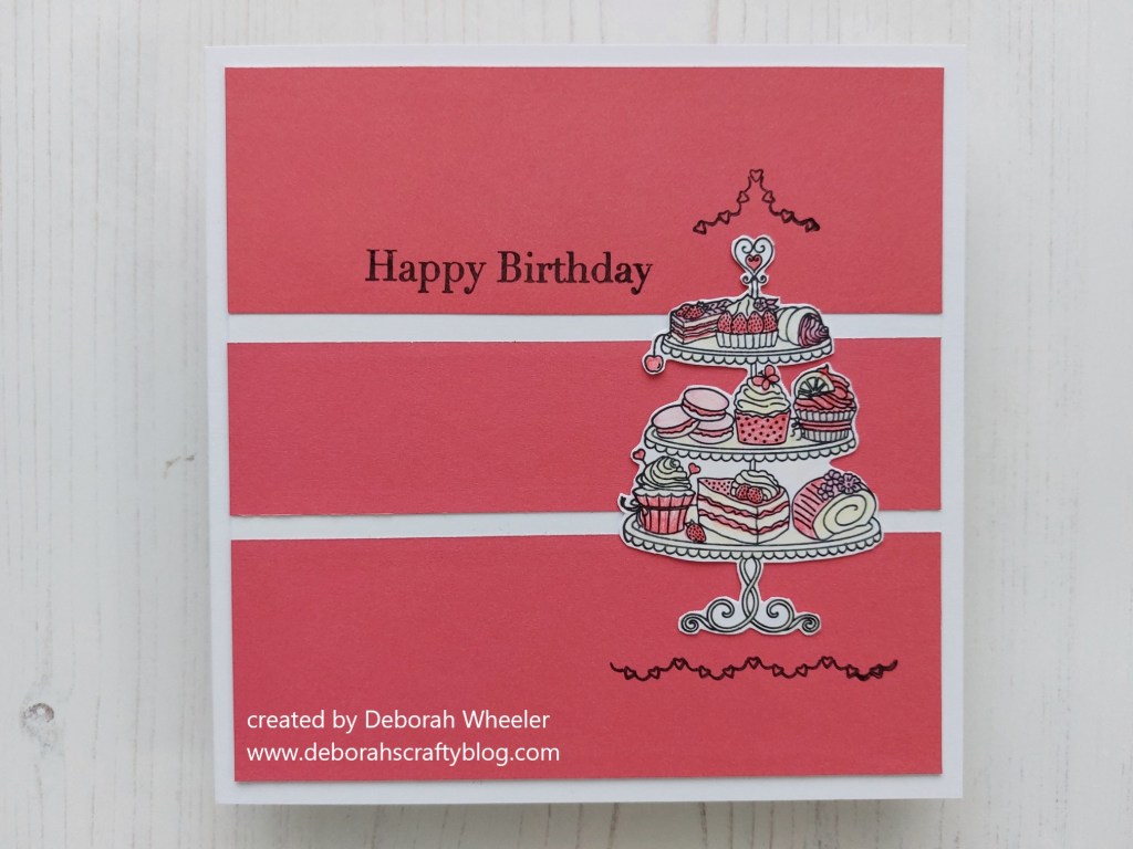 Hello there! I’m back with a rather tempting display of cakes today – I do love celebrating with an afternoon tea! I’ve given ‘Linda’s piece of cake’ stamp a first inking today (it’s been tucked away in my stash for longer than it should have been!) inspired by the moodboard at Just Us Girls, the ‘bon appetit’ theme at The Paper Players, the stripes from Global Design Project and the sketch from Inspire.Create