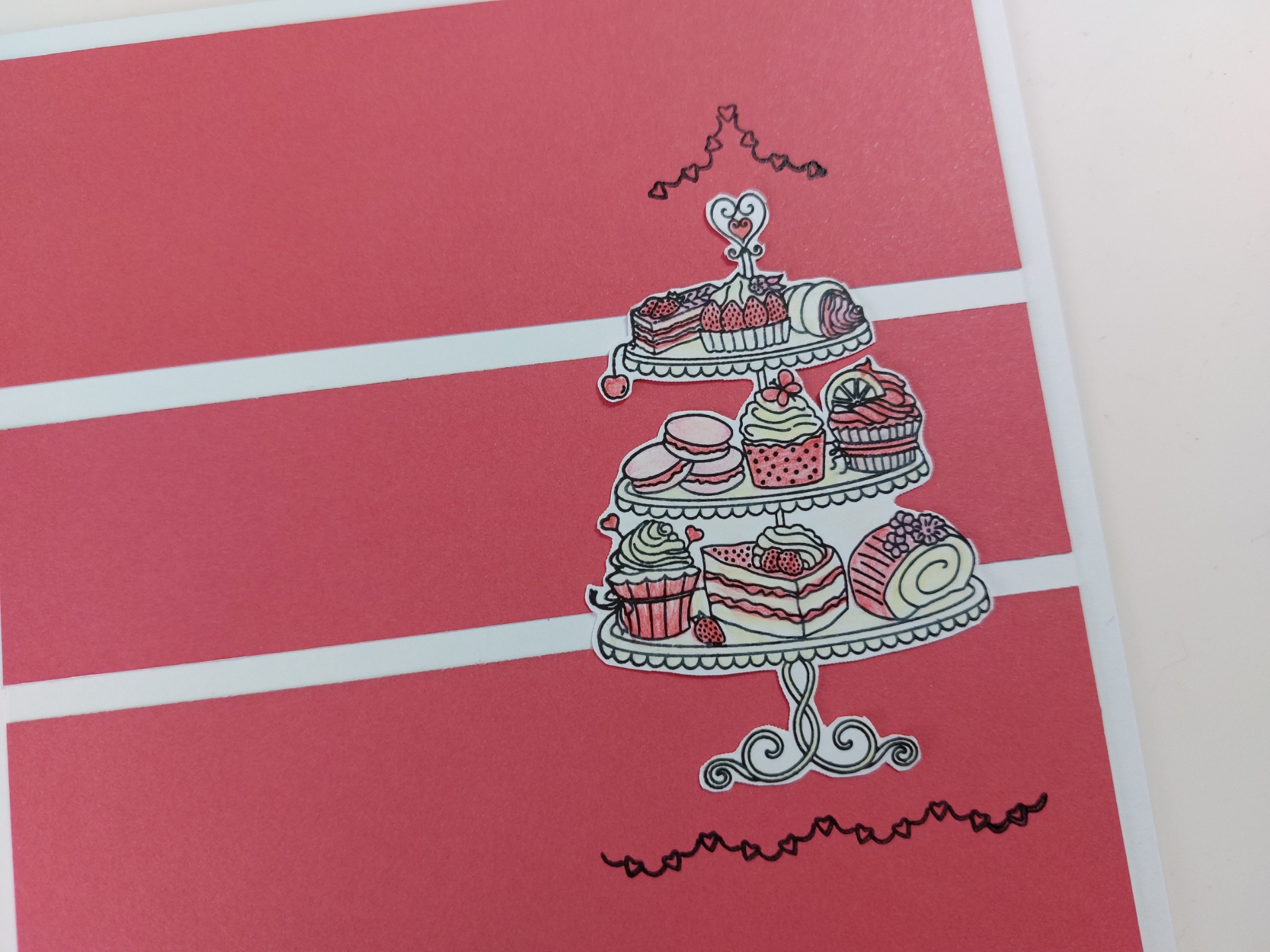 I stamped the cake stand onto a scrap piece of card, coloured it with a mix of Pergaliner and Polychromo pencils and then fussy cut it before gluing it to the card front. I added the two strings of hearts above and below using black Versafine Clair ink