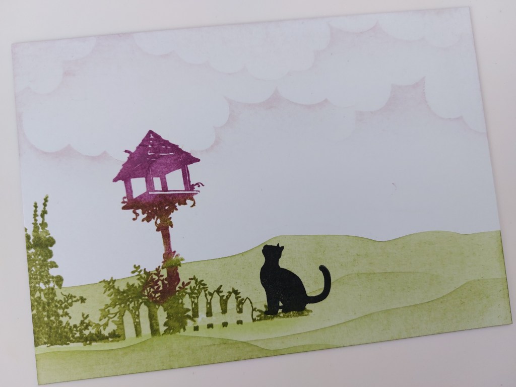 I inked up the birdhouse stamp with ‘peeled paint’ and ‘seedless preserves’, using a sponge to distribute the two inks across the stamp, and then stamped it into place. I added the little cat in black ink and the bush to the left with the ‘peeled paint’.