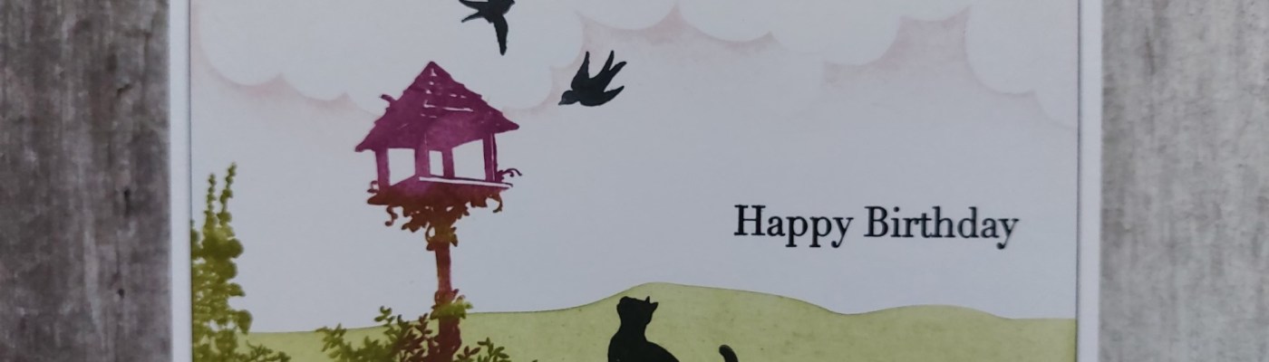 I added a couple of birds (obviously coming in to land on the birdhouse, despite the watchful kitty), together with one of the ‘Occasions’ sentiment and finished by running a black Sharpie around the card edges & attaching it to a 5×7 card blank.