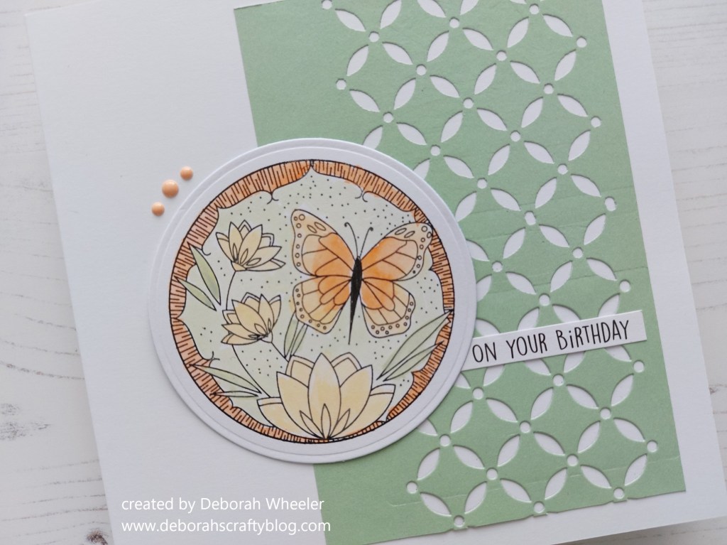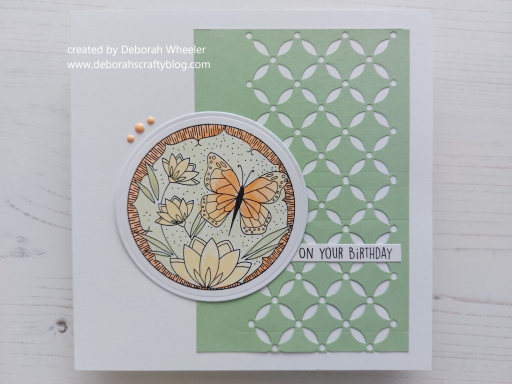 Deborah, your card is just so lovely! I love how you placed the butterflies in the circle (thank you for using the topping!) and your trellis is a nice touch with dimension and interest. Thanks for playing along at Seize the Birthday!