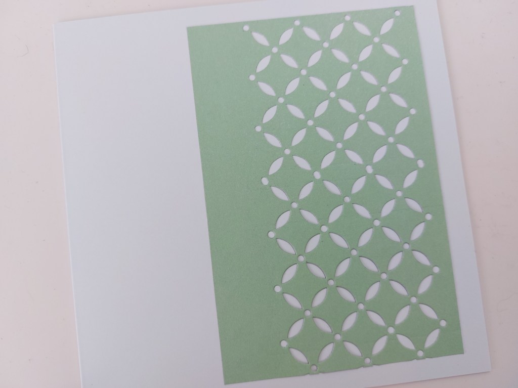 I started with a piece of Clarity’s ‘Waimea Falls’ companion paper in pale green, trimmed to fit a 6×6 card blank, and cut the trellis die into it. I had to cut it three times in all, to get the pattern to run all the way down the paper but that was fairly easy – after cutting the first time, I lined the die up on the paper by overlapping it with the previous holes, so I knew it was properly aligned. Once cut, I attached it to the card blank.