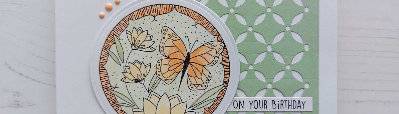 Next was to stamp the butterfly round onto a piece of white card, then watercolour it with Distress Oxides and a waterbrush – I went with ‘ripe persimmon’, ‘dried marigold’ & ‘bundled sage’ as the closest match I’d got to Color Dare’s chart. Once dry, I cut it out with a circle nested die, glued a smaller circle of scrap card on the back to lift it slightly and attached it to the card front.