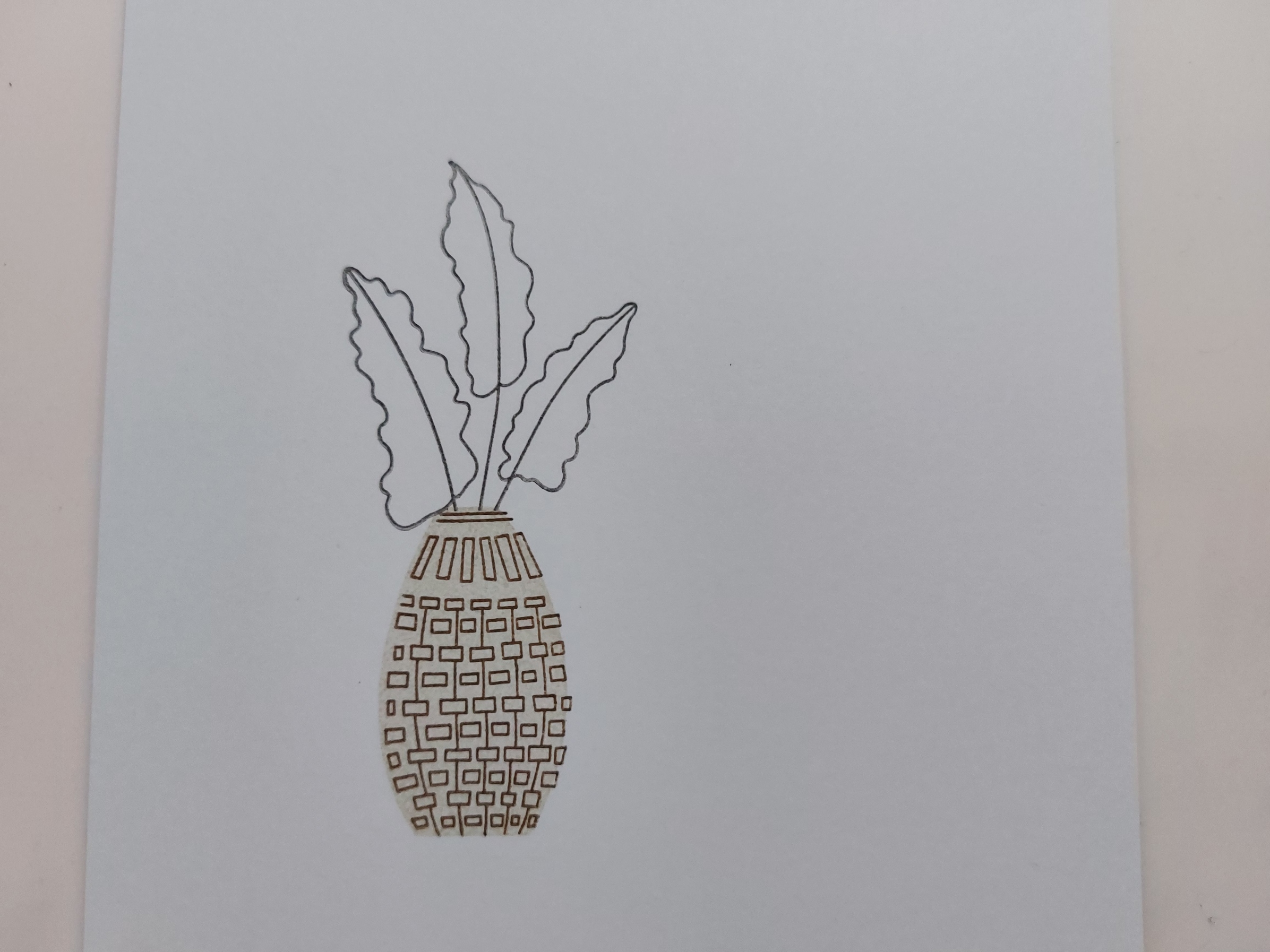 I started by stamping the small vase base image in ‘pumice stone’ Distress Oxide, and then added the pattern overlay in ‘potting soil’ Archival ink. I stamped the large leaves in ‘watering can’ Archival, then cut masks for them from an all-over sticky note & stamped the leafy stems to sit behind them.