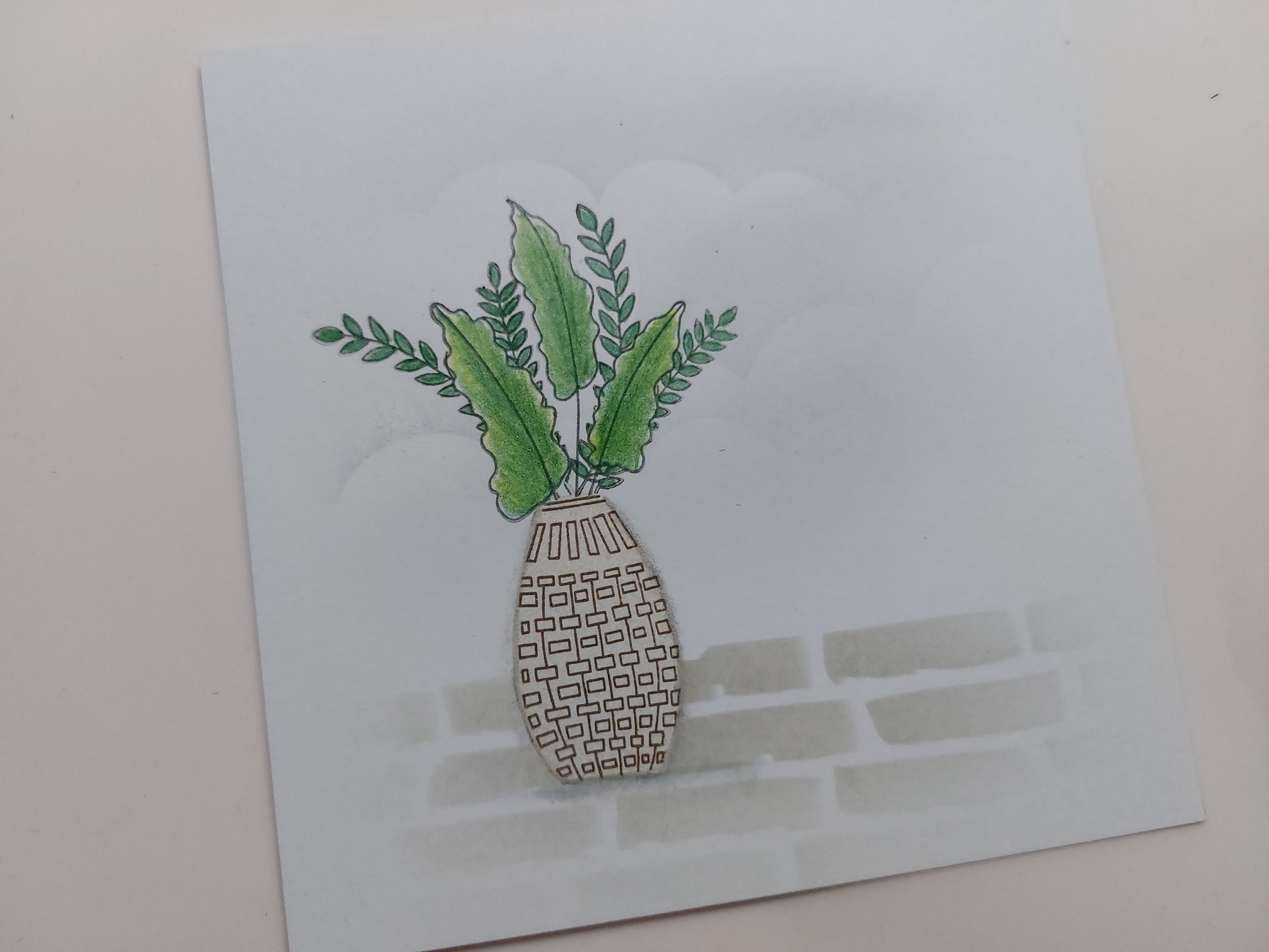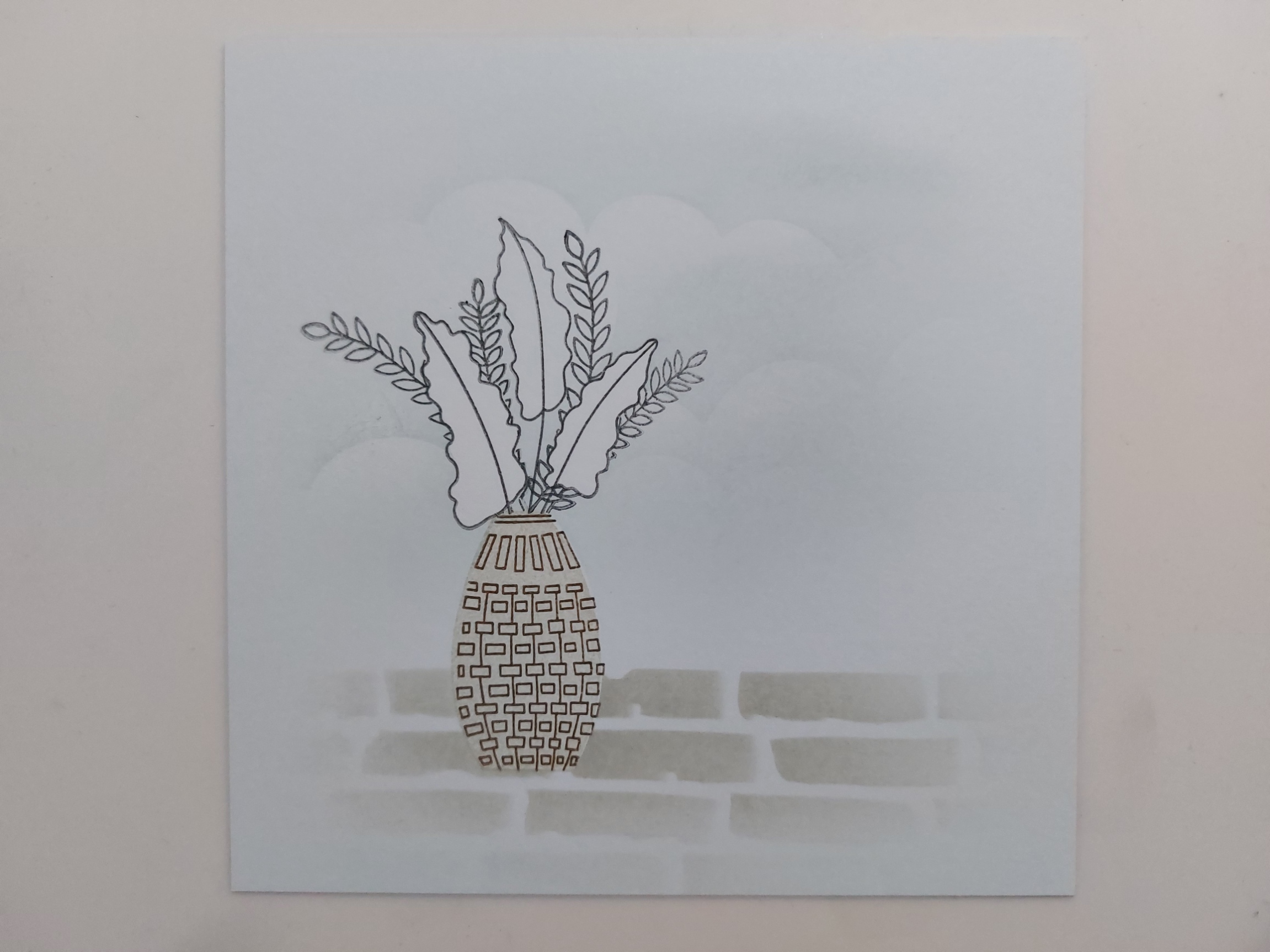 I masked the vase & leaves again so that I could add the ground with Clarity’s ‘brick wall’ stencil, brushing ‘pumice stone’ across it (I was trying to make it look liek a patio area…). The clouds mask was then brushed with ‘speckled egg’ for the sky. After removing the masks, I shaded the leaves with Pergaliner pencils.