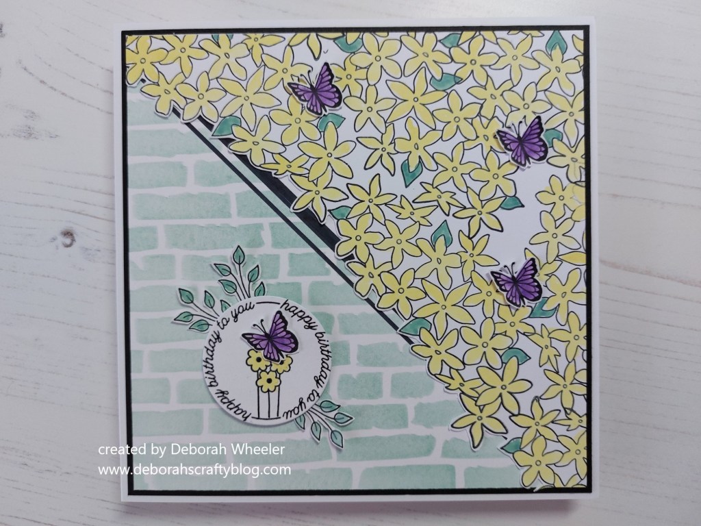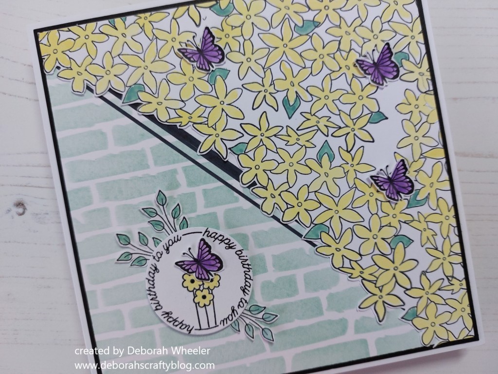 I mounted the card onto a layer of black, then attached it to a 6×6 card blank, before finishing with a few butterflies from the ‘floral frames – happy birthday’ set which I’d coloured with ‘villainous potion’ Distress Oxide, fussy cut and glued into place.