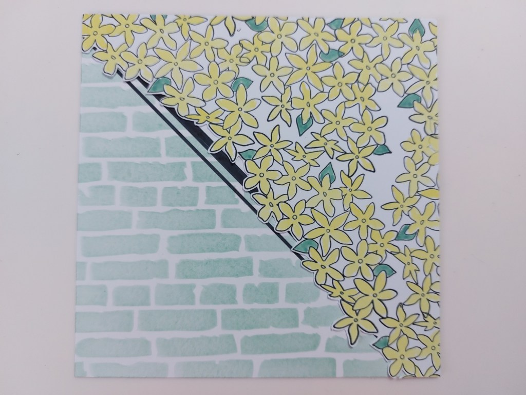 I strated with a couple of squares of white card. I brushed ‘evergeen bough’ Distress Oxide across the lower doaginal on the first one, adding two lines with a black Sharpie to reflect HSS’s sketch. I then repeat stamped the flowers on the top diagonal section of the other card and watercoloured them with ‘squeezed lemonade’ and ‘evergreen bough’ – it wasn’t until I was doing this that I noticed there were little leaves scattered amongst the flowers!