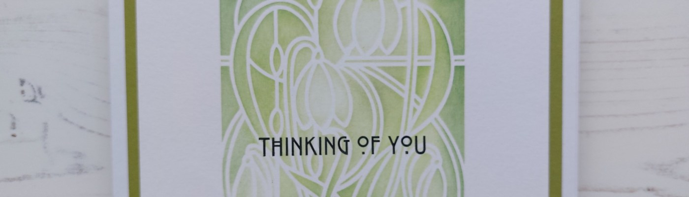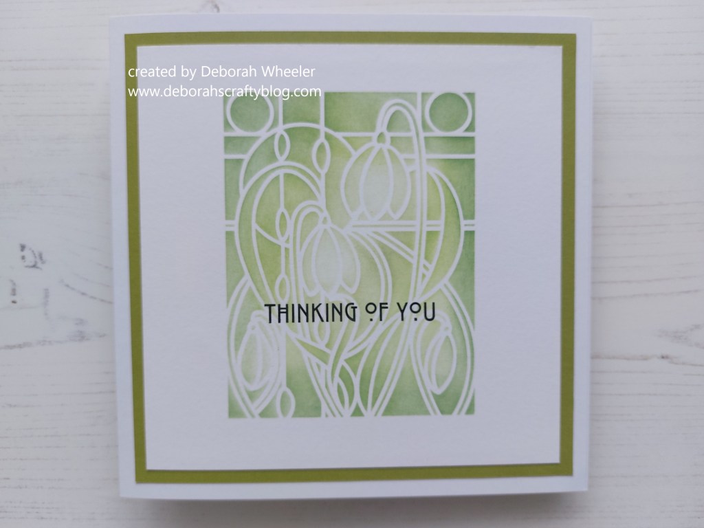I started by attaching the stencil to a piece of Clarity’s 7×7 stencil card and then blended ‘bundled sage’, ‘mowed lawn’ & ‘rustic wilderness’ Distress Oxides through it, starting with the lightest shade in the centre and then working outwards – I was aiming to keep the snowdrops as pale as possible without losing the stencil outline. I then added the ‘Thinking of you’ art nouveau sentiment in black.