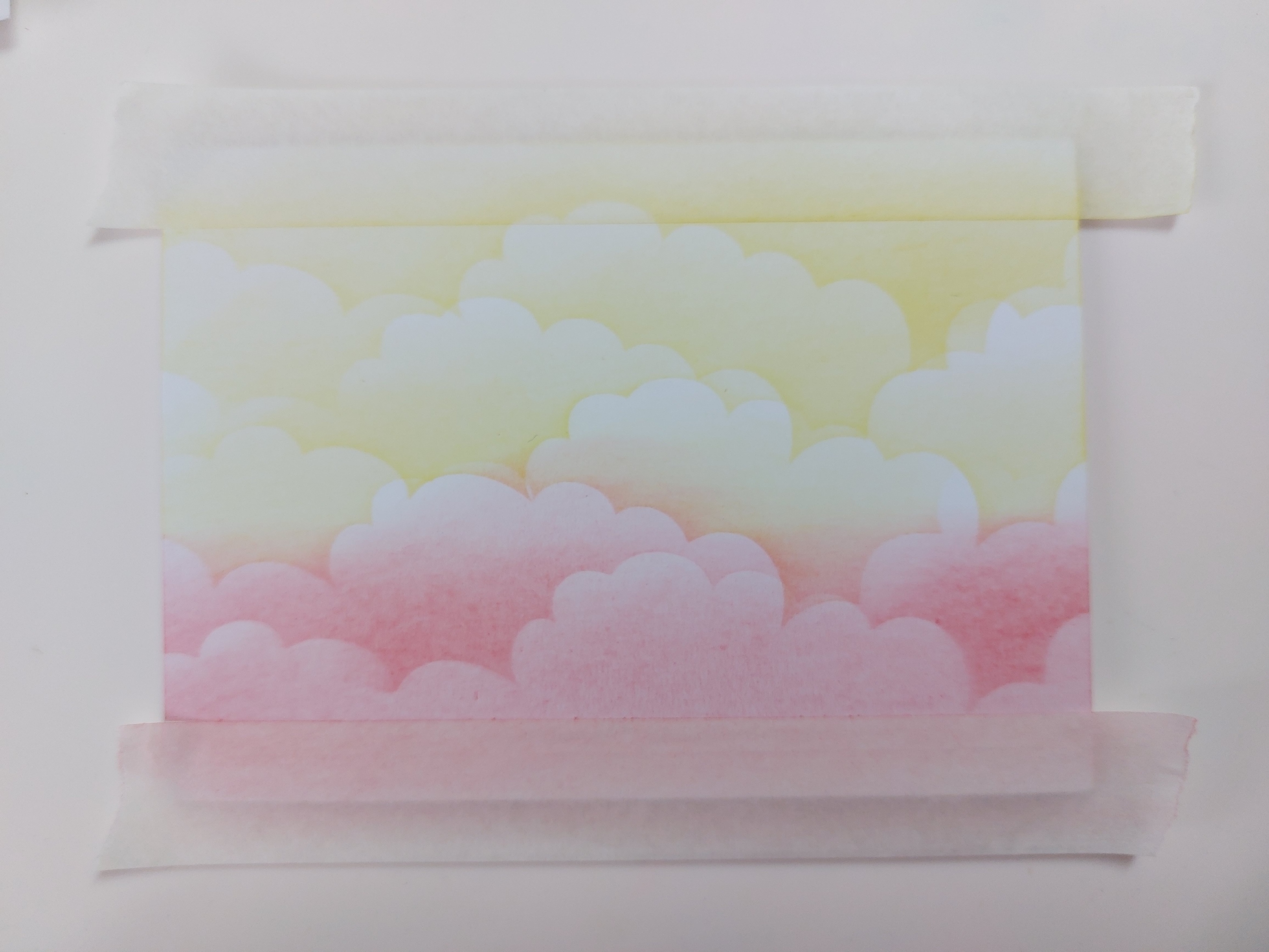 I started with an A6 card blank (don’t use these very much these days), ran masking tape across the top and bottom edges and then added clouds with the Clarity mask, brushing ‘squeezed lemonade’ at the top and ‘festive berries’ at the bottom. I cut the hot air balloon aperture into a piece of white card and then attached it over the stencilled clouds (I’d remembered to put a layer of thin double sided adhesive sheet onto the card before die cutting it)