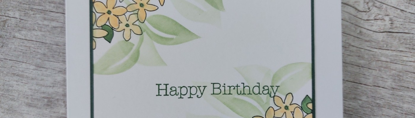 I used a waterbrush with ‘dried marigold’ and ‘rustic wilderness’ Distress Oxides to colour in the stamped flowers & leaves, then mounted it on a piece of dark green Rainbow River companion paper and onto the 5×5 card blank. I finished with one of the ‘Occasions’ sentiments in the ‘rustic wilderness’.