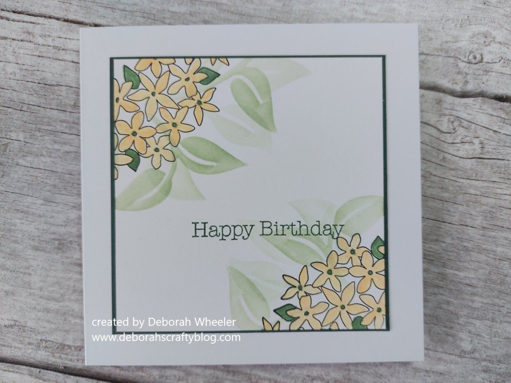 I started with a small square of card cut to fit on a 5×5 card blank and brushed ‘bundled sage’ Distress Oxide through a few of the leaves from the ‘double vine’ stencil onto two of the corners. I repositioned the stencil to add a few more leaves in, but didn’t add any more ink to my brush to give a lighter tone. I then stamped the Craft Club flowers into each of the corners.