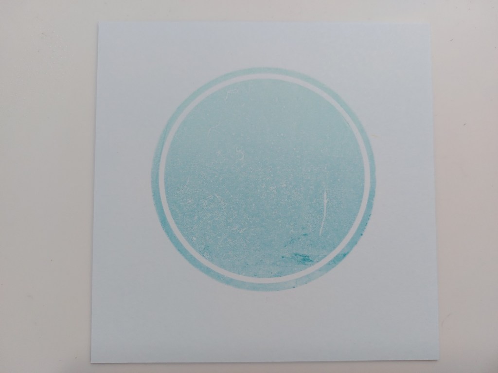 I started with the smaller of the circle backdrop stamps and brayered ‘salvaged patina’ & ‘broken china’ Distress Oxides onto it, then stamped the image onto a square of card cut to fit a 6×6 card blank.