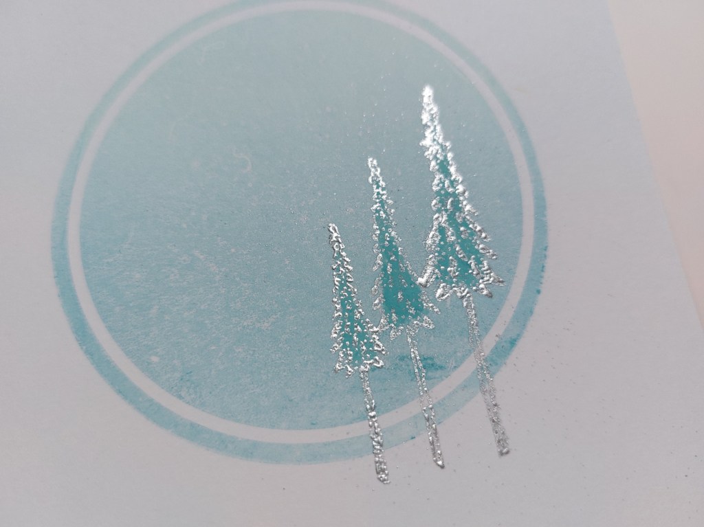 I stamped the three trees from the set with WOW’s clear embossing ink, then heat embossed them with silver superfine powder & ‘salvaged patina’ with a waterbrush