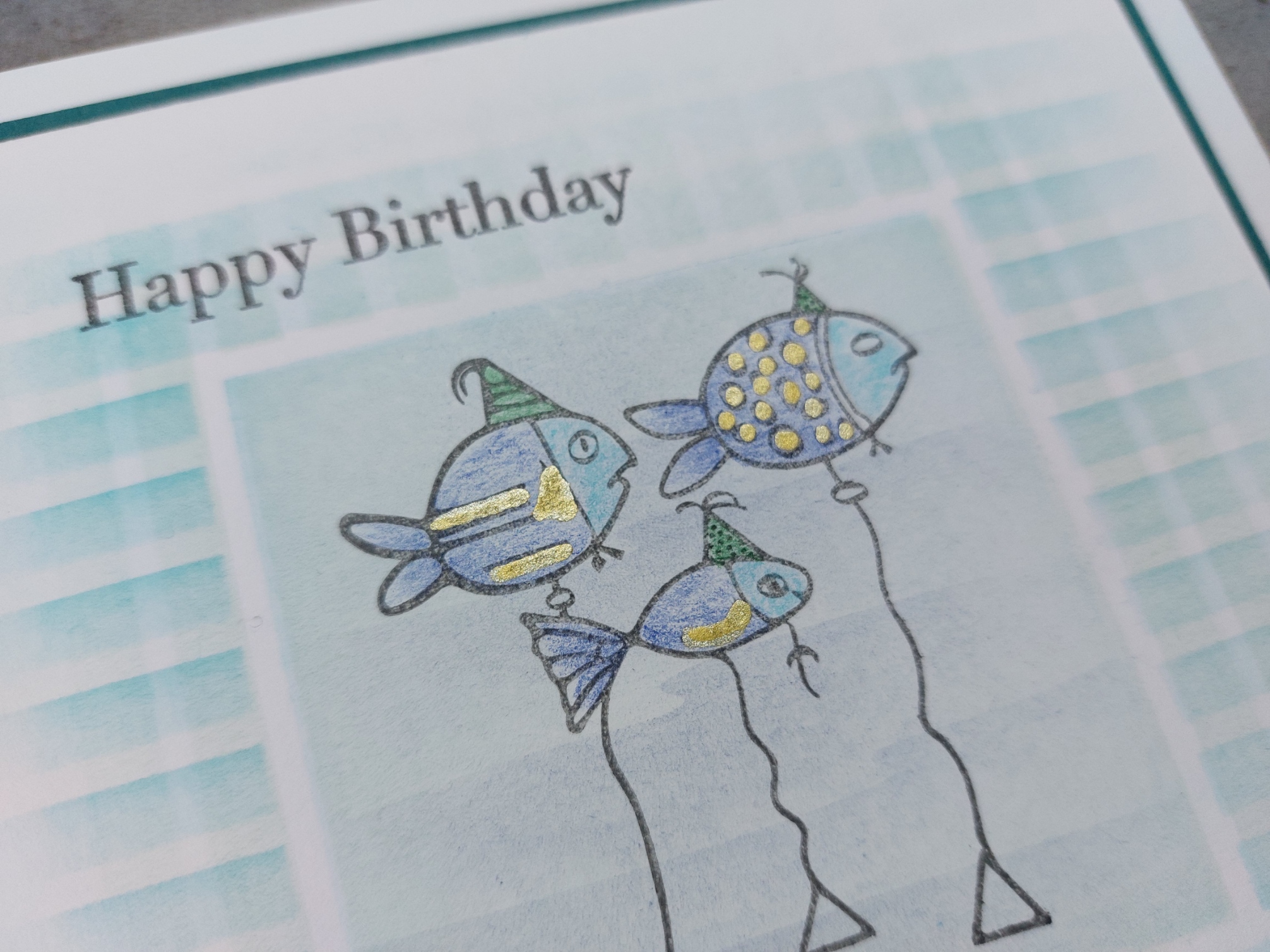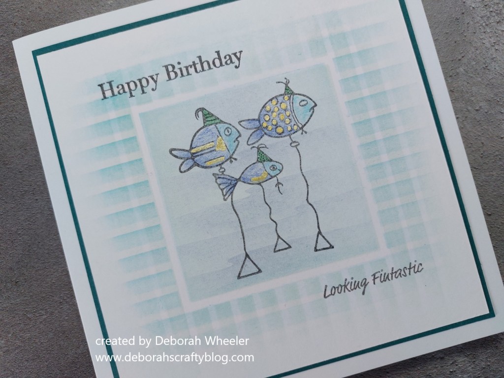 I added gold highlights to the fish with a Posca pen and then stamped the sentiments with the ‘watering can’ – ‘looking fintastic’ is from the ‘koi carp’ set. I mounted the topper onto a layer of teal card and attached it to a 6×6 card blank.