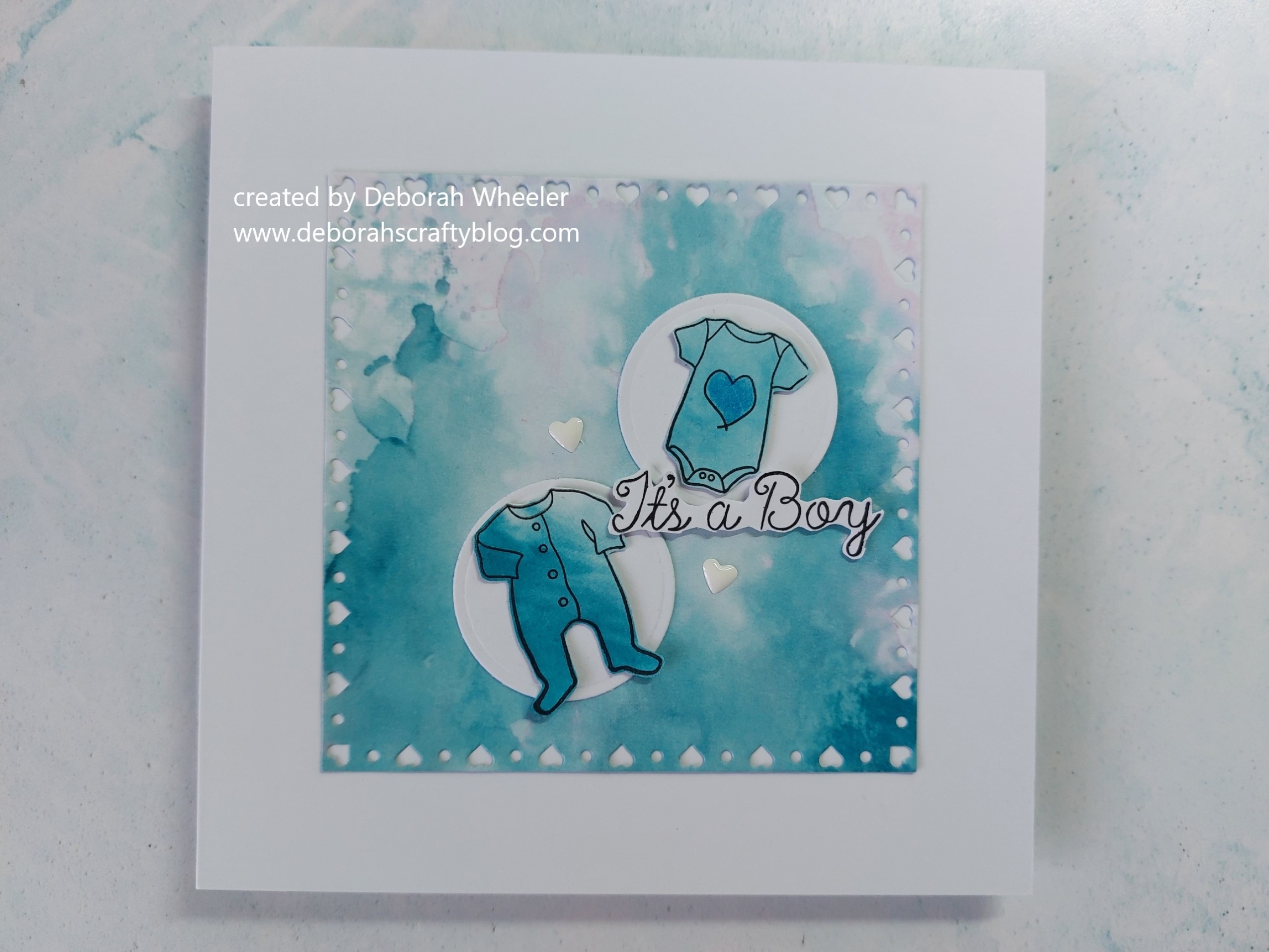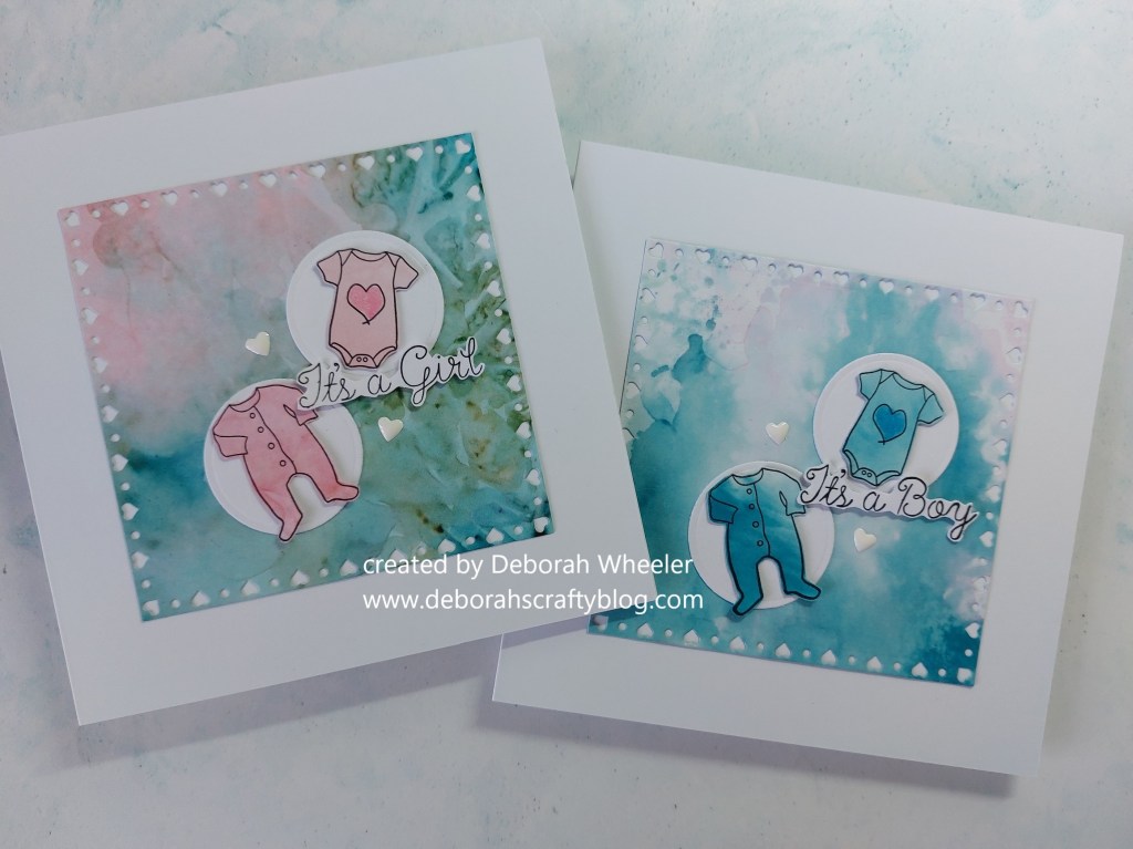 Hello crafty friends. I’m back with a couple of cards today that I made with ClarityCrafts ‘adorable baby’ stamp set and one of their new ‘nested square hearts doodle frame-it panels’ dies.