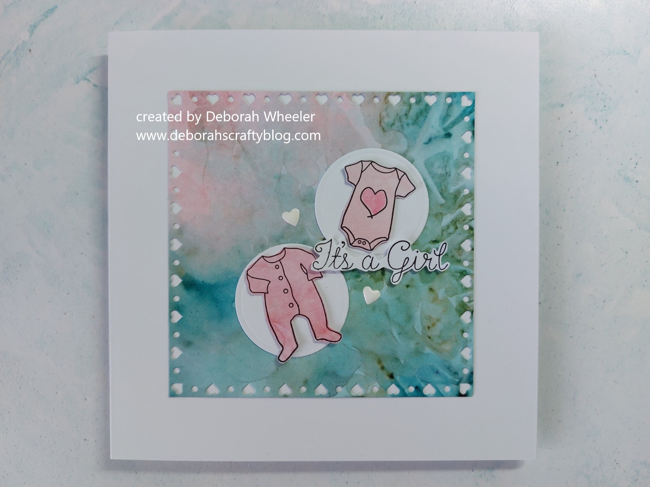 I started with one of the new doodle heart panel dies, cut a square of Antarctica designer paper with it adn attached it to a 6×6 card blank. I found another offcut of the paper that was mainly pinks, part stamped the baby clothes on the washing line onto it and fussy cut the babygro and vest, adding shade to the heart with a Pergaliner pencil.