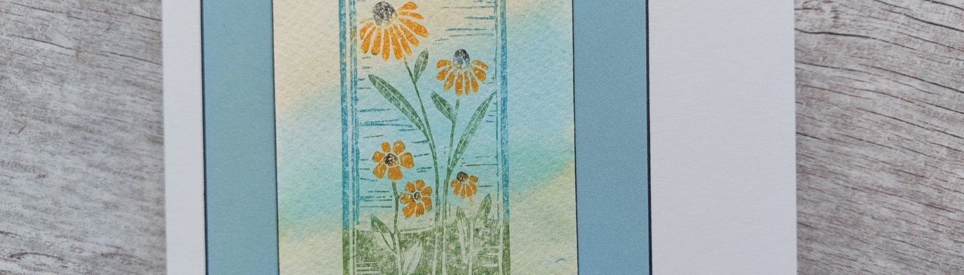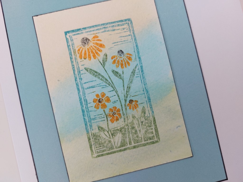 I started with a piece of watercolour card that I’d coloured with left over ink from a previous project. I inked up the image one of the linocut stamps (as opposed to the background infill) using cotton buds, so that I could get the different colours onto the individual parts – I used my stamping platform to do this, so I could stamp each colour in turn. I used ‘rustic wilderness’ for the ground & leaves, ‘broken china for the sky, ‘carved pumpkin’ for the petals & black Vesafine Clair for the flower centres.