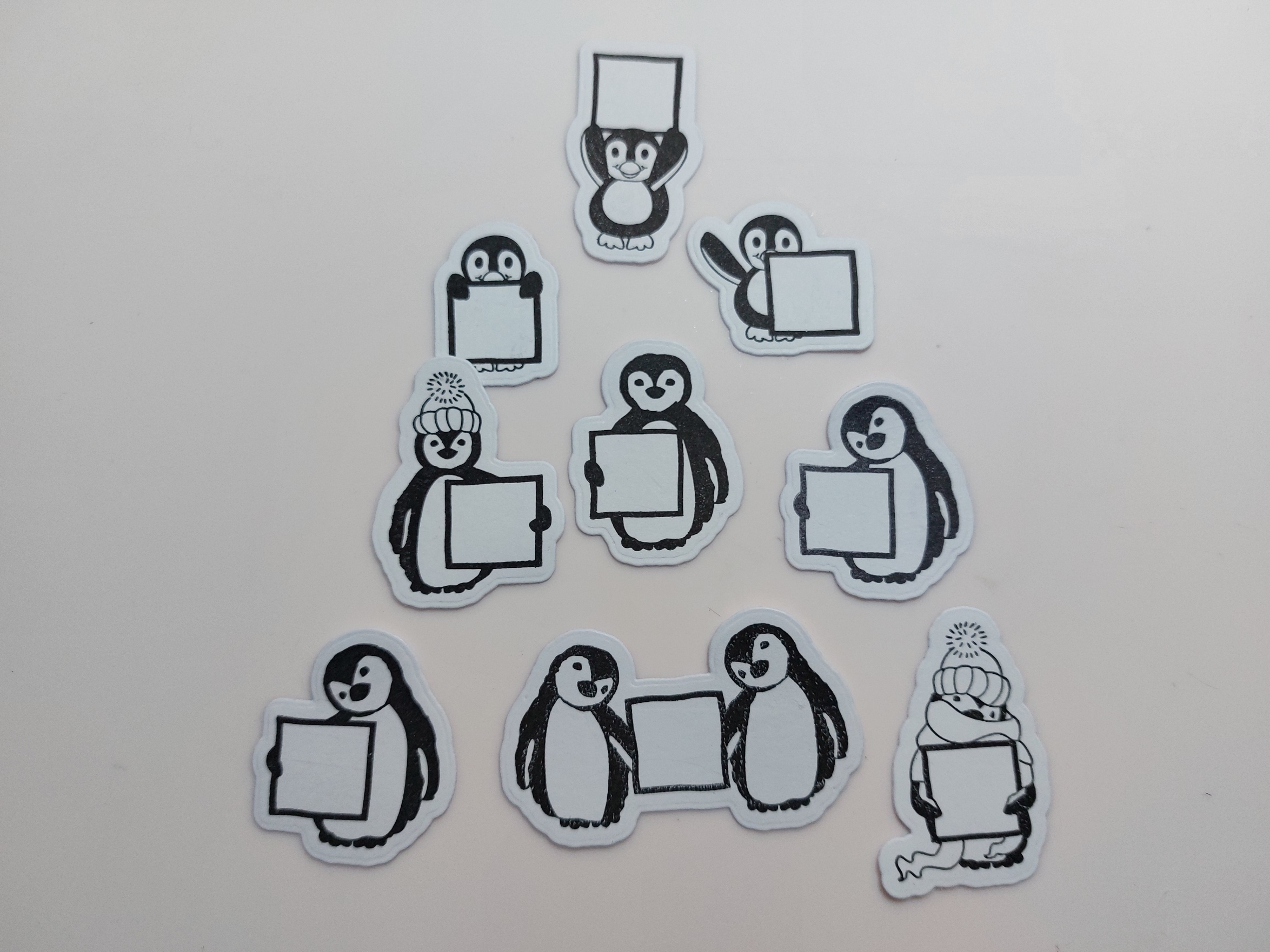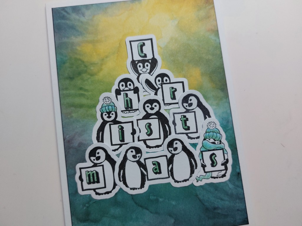 I glued the penguins onto a piece of Northern Lights card to make a Christmas tree shape, starting with the bottom row & tucking the others in behind. Now before everyone gets all David Attenborough on me, I know that’s impossible for penguins but Clarity don’t make any aurora australis (southern lights) paper, so let’s just live with it!