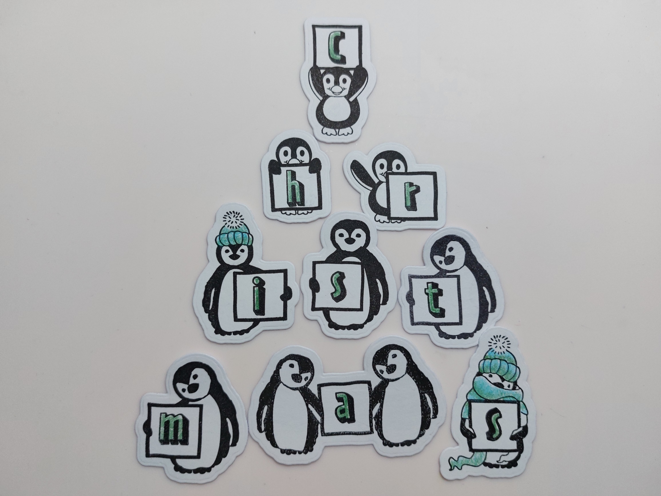 I started by stamping out several of the penguin letterboxes in black ink on scrap card & cutting them out with the co-ordinating dies. I added the letters to spell ‘christmas’ with the penguin alphabet stamps and shaded them with Pergaliner pencils. Now at this point, I should explain that Percy did not want to be in the photo (he was needed to make up the numbers) so refused to remove his hat & scarf & is holding his letter upside down in protest! Nothing to do with my stamping ability…!