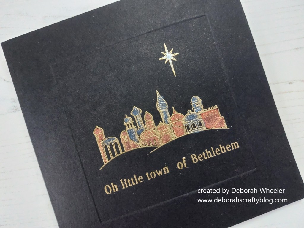 I started by embedding a square frame into the front of a black 6×6 card blank. I heat embossed the Bethlehem scene onto it with WOW’s superfine gold metallic powder, adding the sentiment below it.