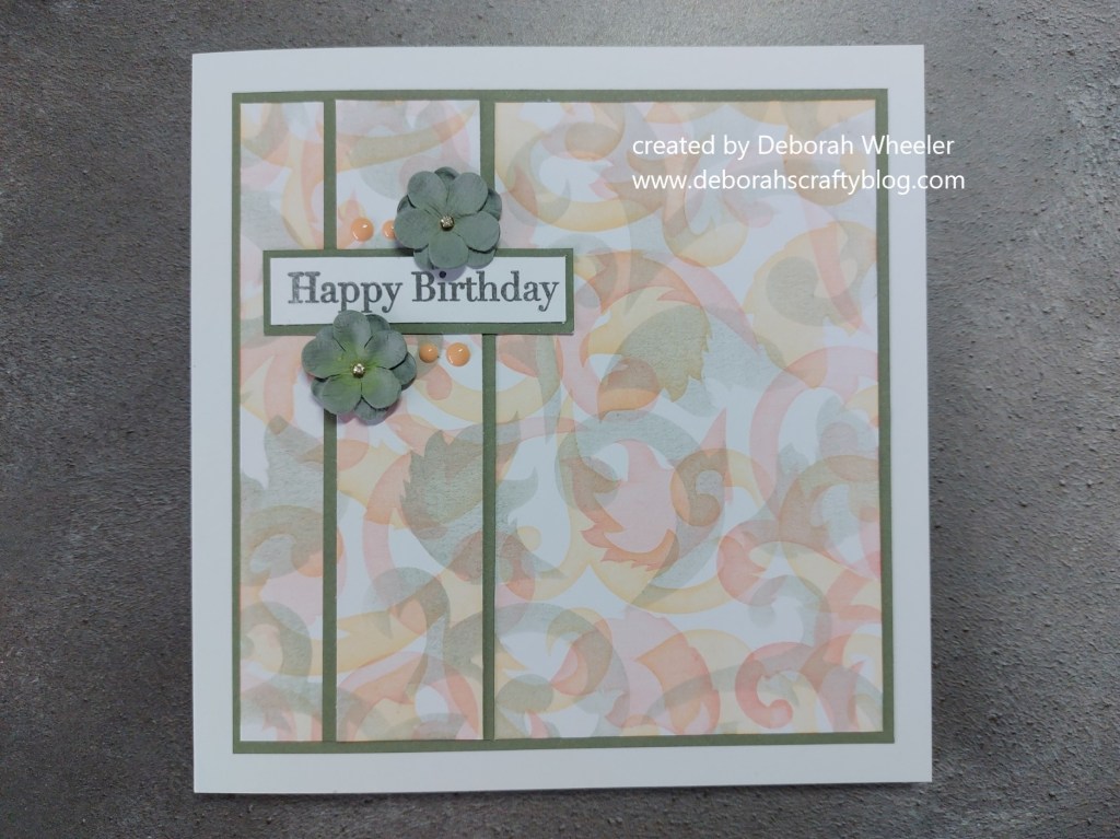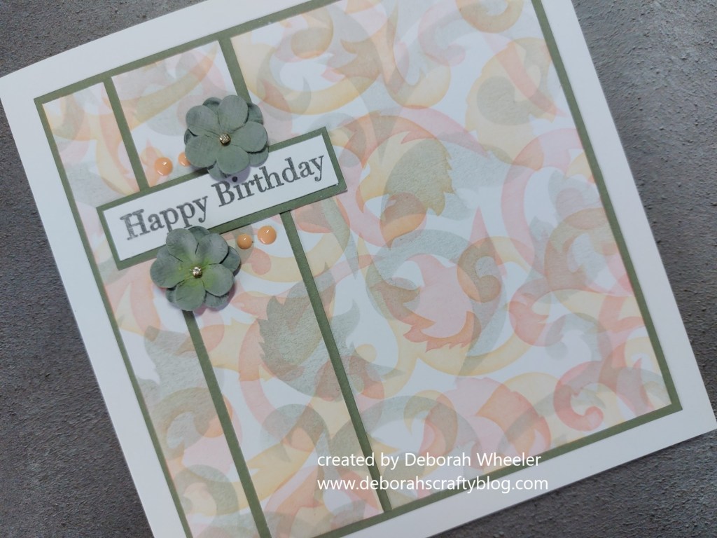I cut the stencil into three pieces and mounted the outer two onto a square of Northern Lights complanion paper, attaching it to the front of a 6×6 card blank. I popped the remaining strip onto another piece fo the paper and then added that to the card front, to pick up the sketch. I finished with one of the ‘occasions’ sentiments’ in ‘watering can’ Archival ink, again mounted on a piece of the Northern Lights paper, with a few Glossies gems and two of Clarity’s handmade paper flowers in a matching green