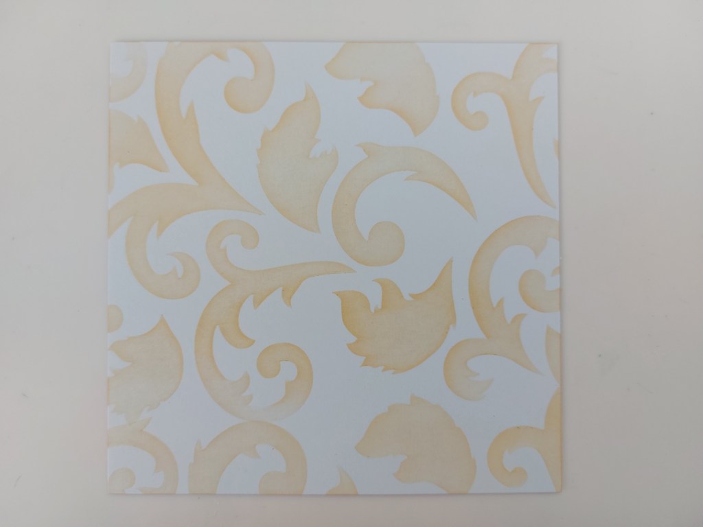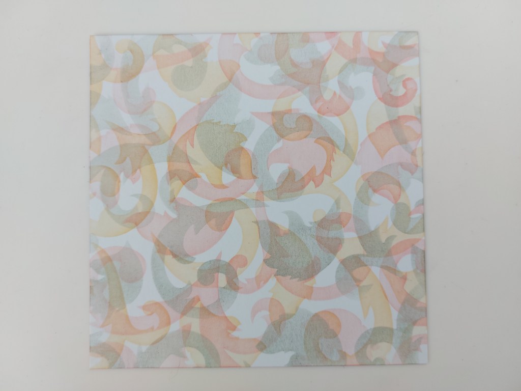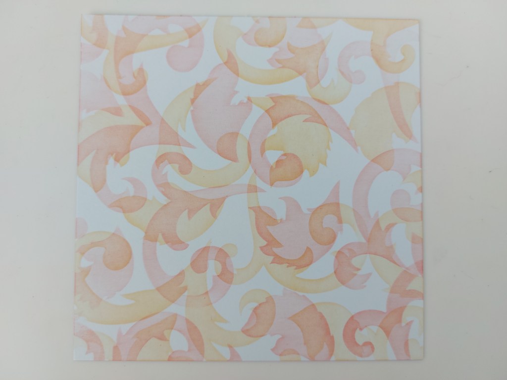 I laid the sentil on a square of white card cut to fit on a 6×6 card blank and brushed ‘dried marigold’ Distress Oxide through it. I turned the card 90 degrees, then lightly brushed ‘barn door’ through the stencil (it’s the nearest shade I’ve got to the one in the challenge). Finally, I turned the card 90 degrees again and brushed ‘iced spruce’ through the stencil, which gave me this lovely multicoloured effect.