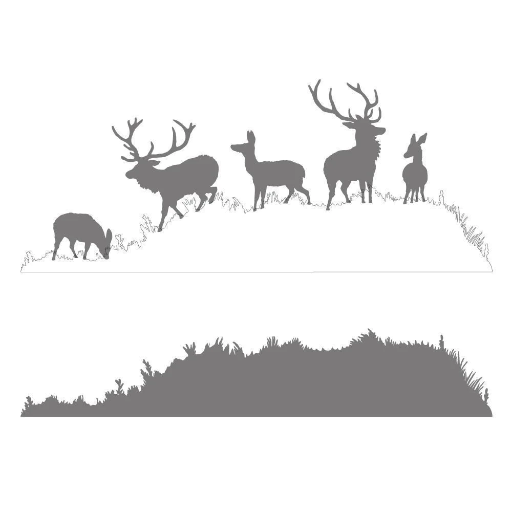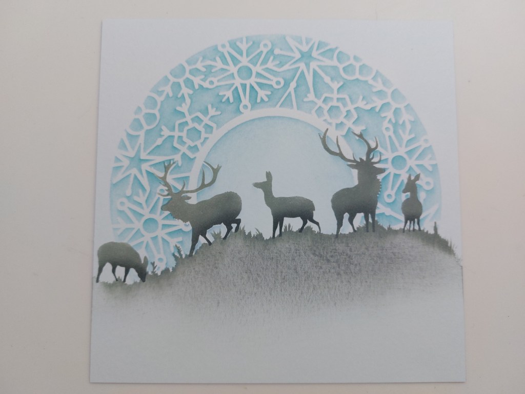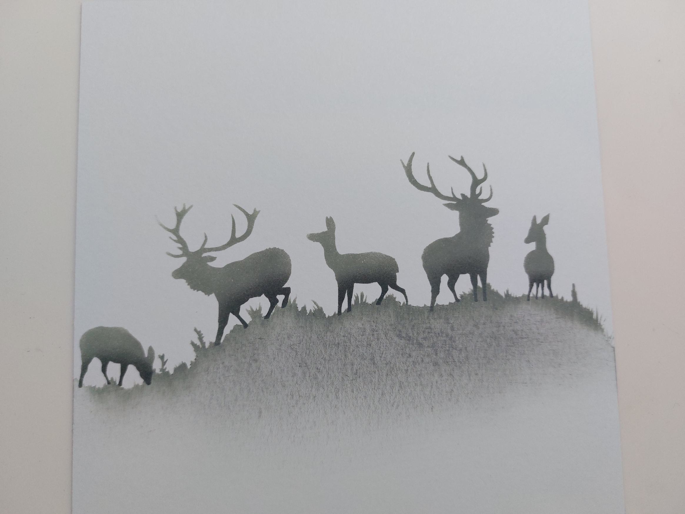 I started with the deerscape mask on a 6×6 square of card and brushed ‘hickory smoke’ Distress Oxide through the hill part. I then overlaid the deer mask so that they were stood on the grass and sponged more of the ‘hickory smoke’ through them.