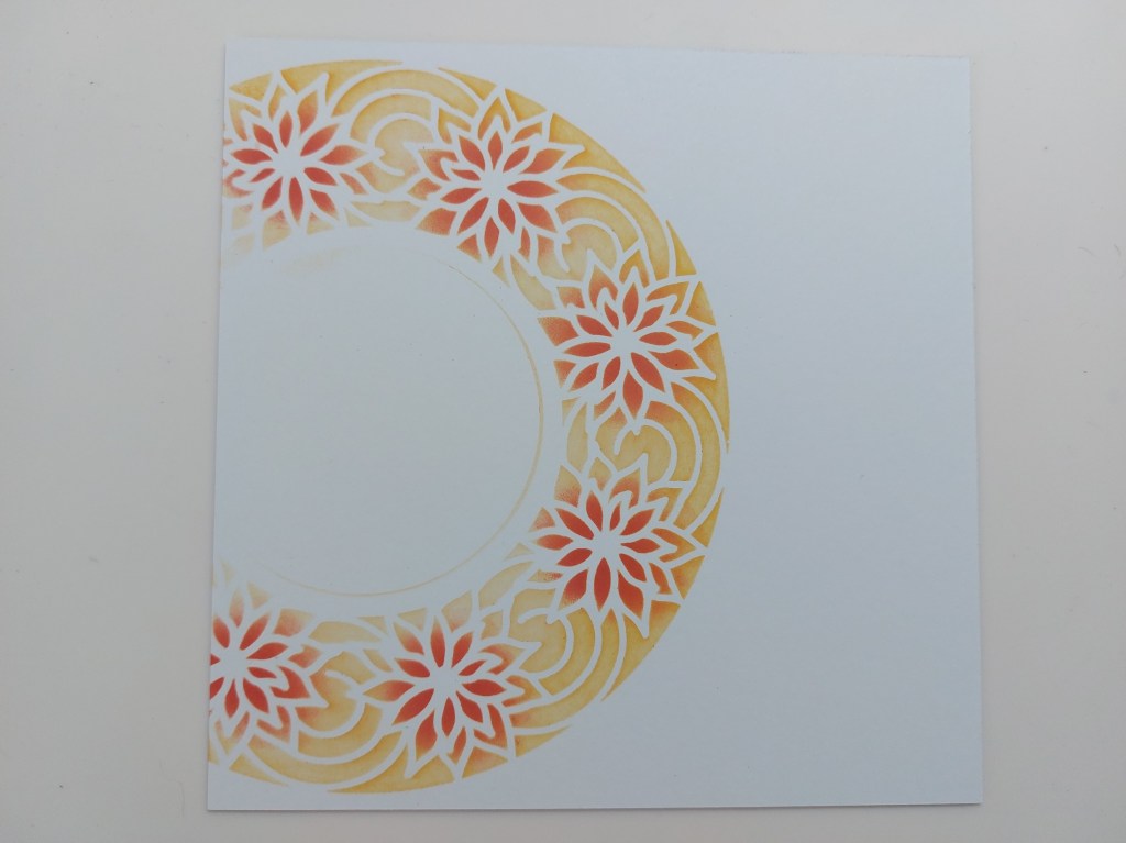 I started with a square of card trimmed to fit a 6×6 blank. I offset the stencil onto it and ran it through my embossing machine to give the pattern a little more definition. These are finer stencils than usual, but you can still get a slight embossed pattern with them. I kept the stencil in palce and added the centre piece to keep that area white. I brushed ‘dried marigold’ & ‘carved pumpkin’ Distress Oxides through the stencil, keeping the lighter shade towards the centre, then sponged ‘candied apple’ onto the poinsettias.