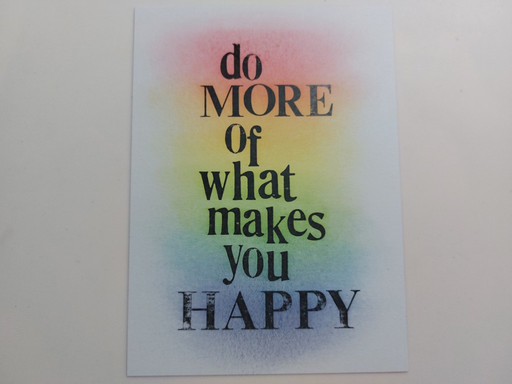 I opted to blend a rainbow of colours onto the card with ‘chipped sapphire’, ‘broken china’, ‘mowed lawn’, ‘squeezed lemonade’, ‘carved pumpkin’ & ‘festive berries’ Distress Oxides to reflect the happy vibe of the quote. I didn’t bother with masking a frame, just kept the ink towards the centre so the blending had soft edges.