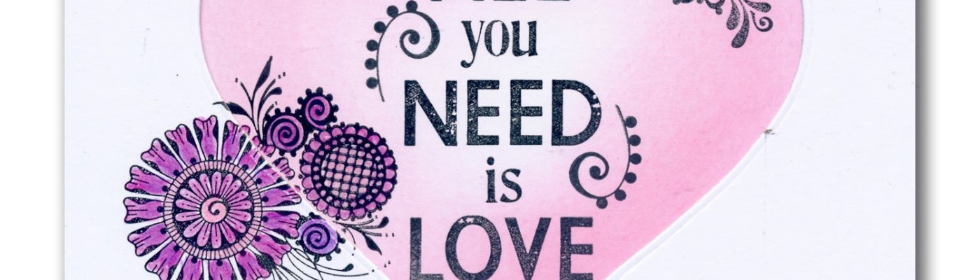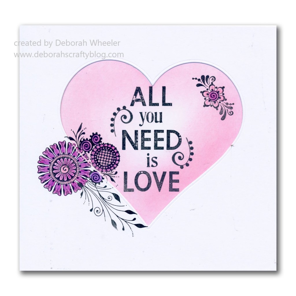 I next stamped the floral swirl from the ‘henna happy anniversary’ set along the side of the heart, again using the ‘watering can’. I used my platform for this and first popped a piece of scrap paper inside the card to cover the heart while I stamped the image on the card front. I left the stamp in place on the platform, folded the card open, positioned the copy paper outer mask back over the heart and stamped the image onto the inside. Doing it this way meant I didn’t get a ‘halo’ on the image from the edge of the aperture. I then shaded the images with Pergaliner pencils in pinks & purples.