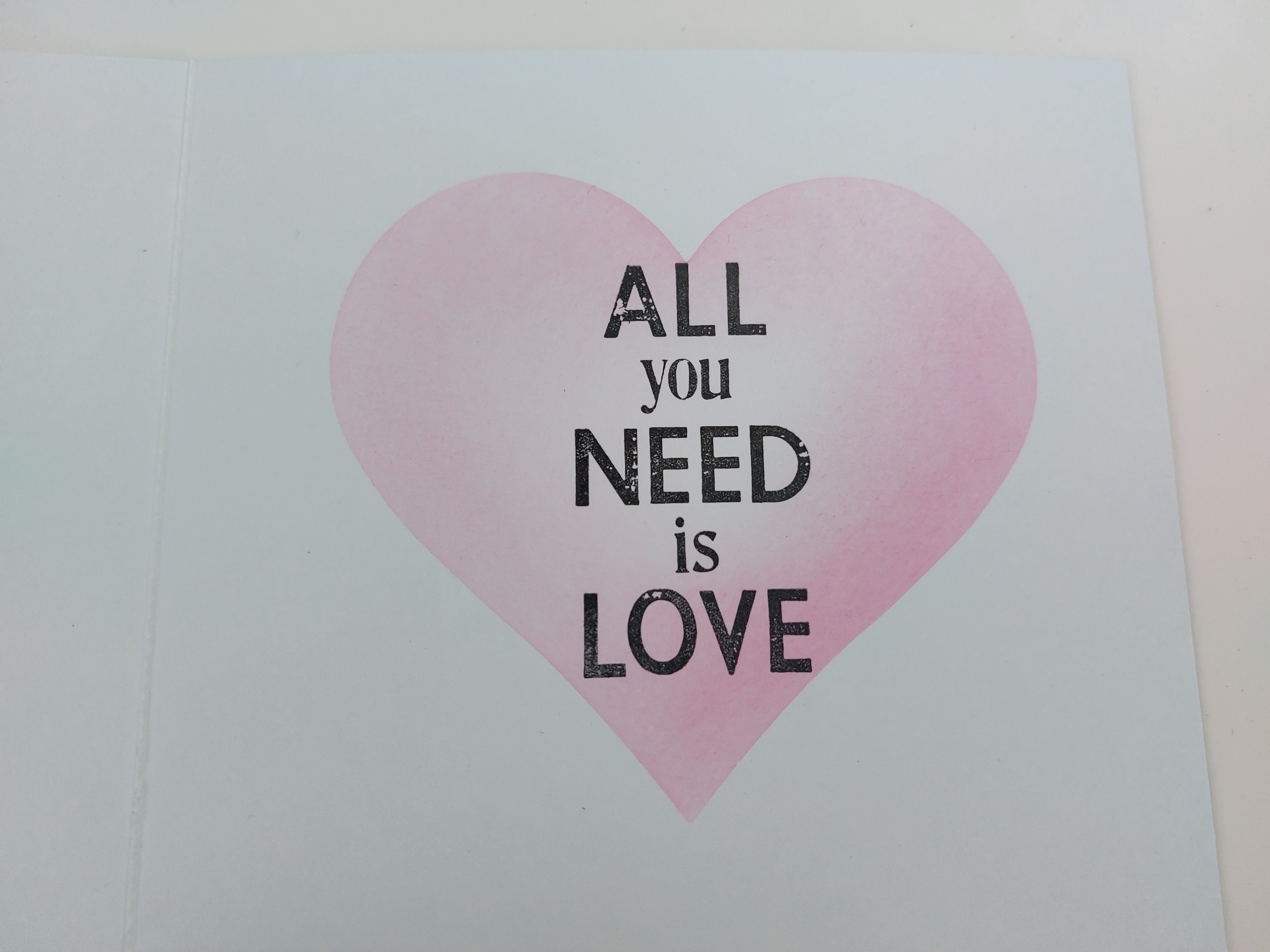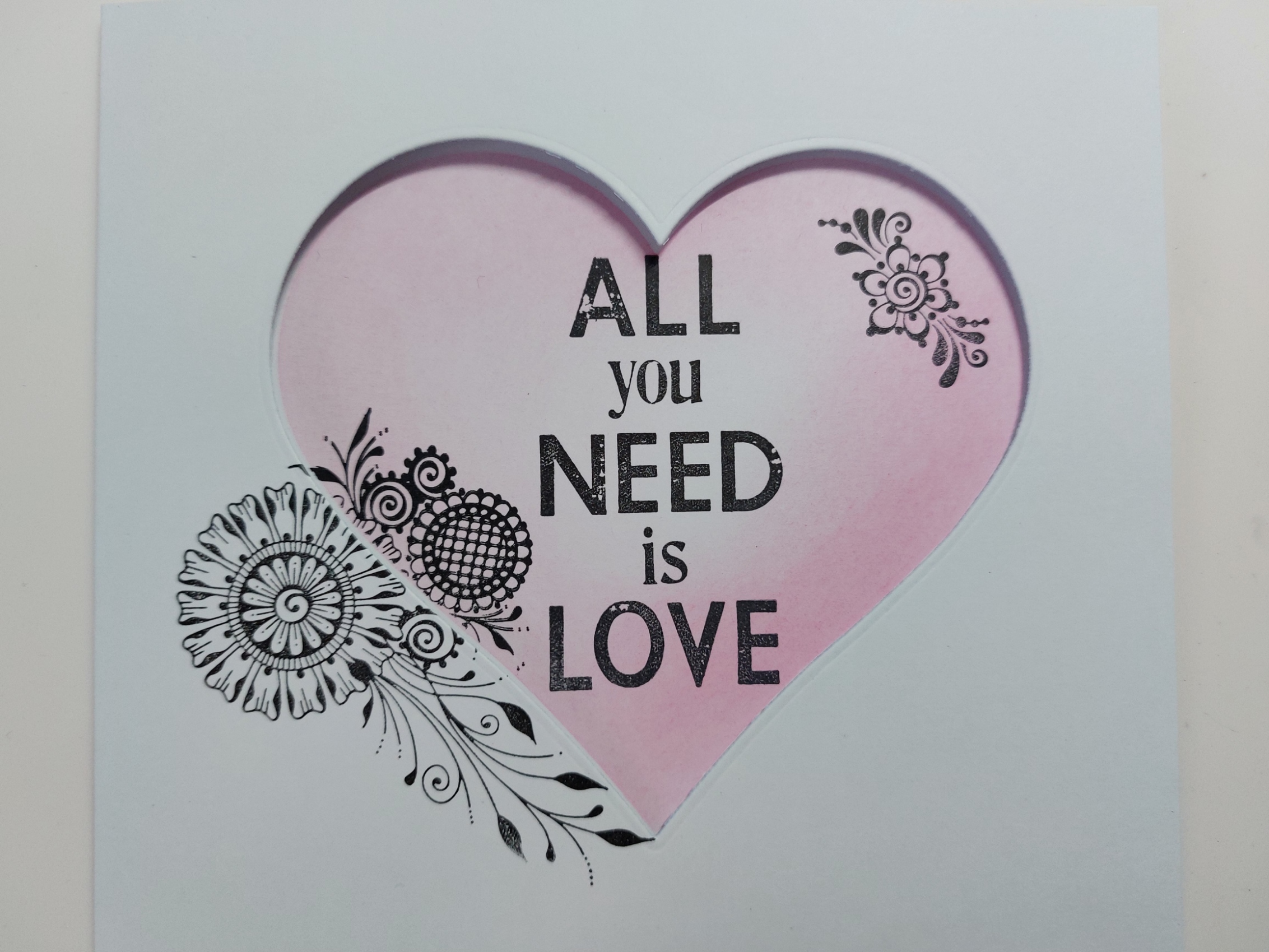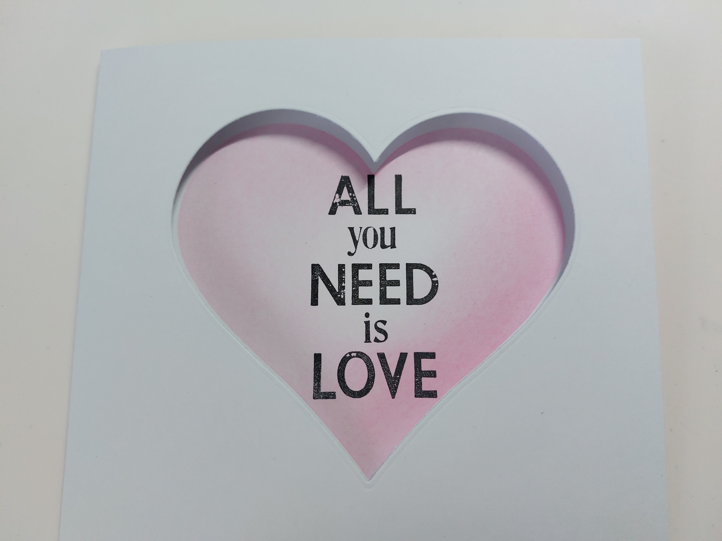 The first step was to die cut the heart aperture into the front of a 6×6 card blank. I also cut a mask from copy paper, then lined it up on the inside of the card and brushed ‘kitsch flamingo’ & ‘picked raspberry’ Distress Oxides through it. I then stamped the quote into place using ‘watering can’ Archival ink.