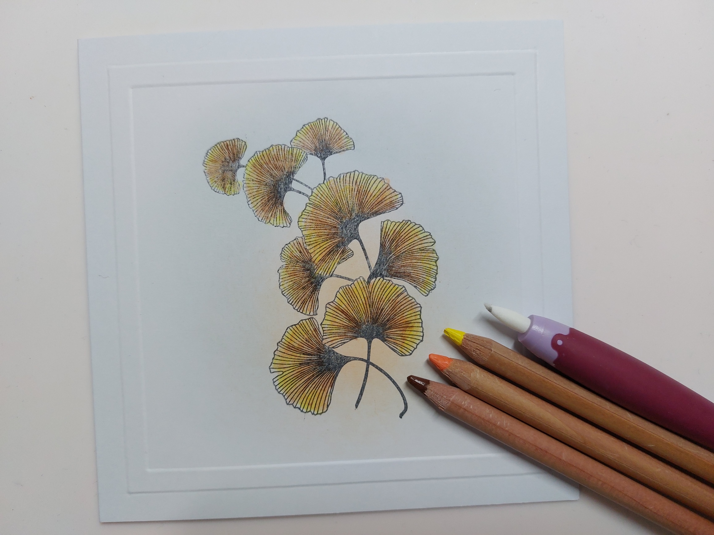 I stamped the ‘ginkgo spray’ over the inked area using ‘shadow grey’ Archival ink and then coloured the leaves with Pergaliner pencils, using a blending nib to smooth out the tones.