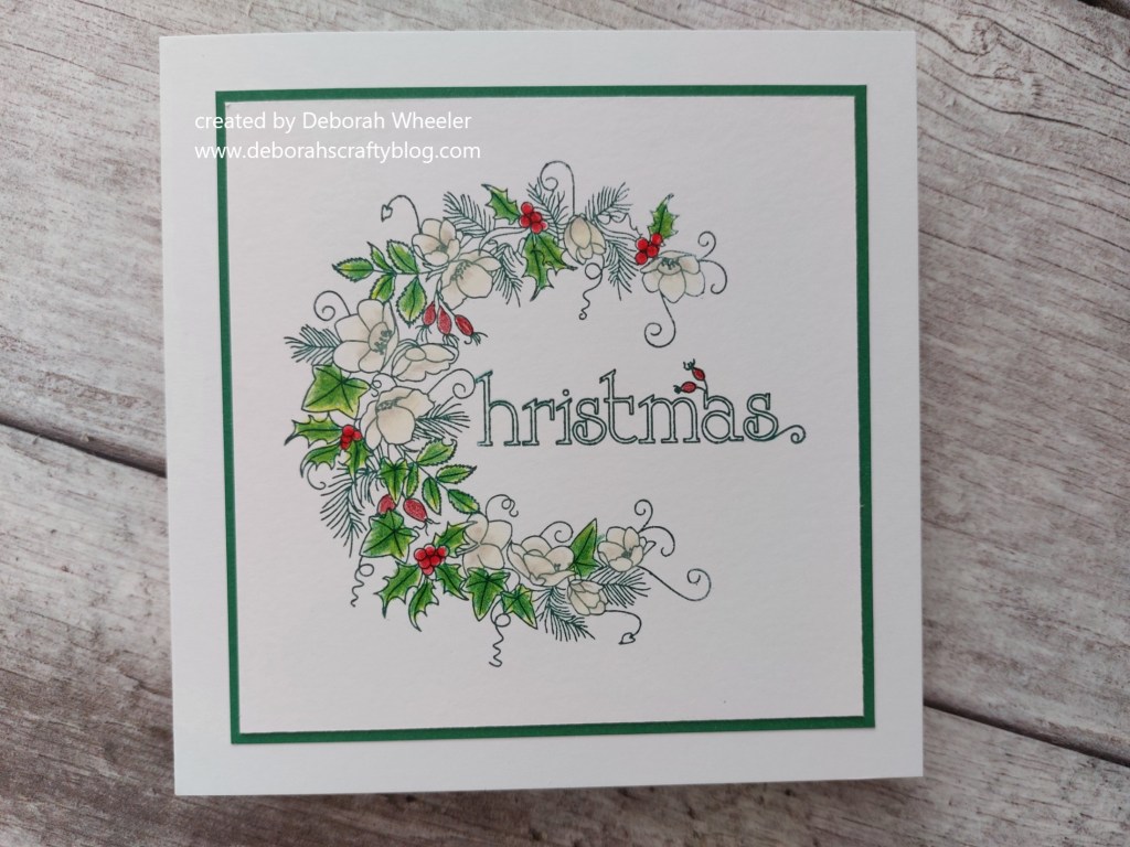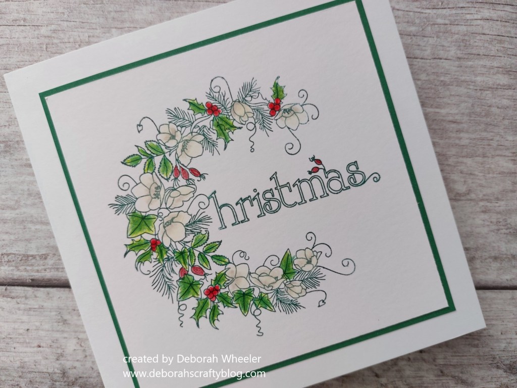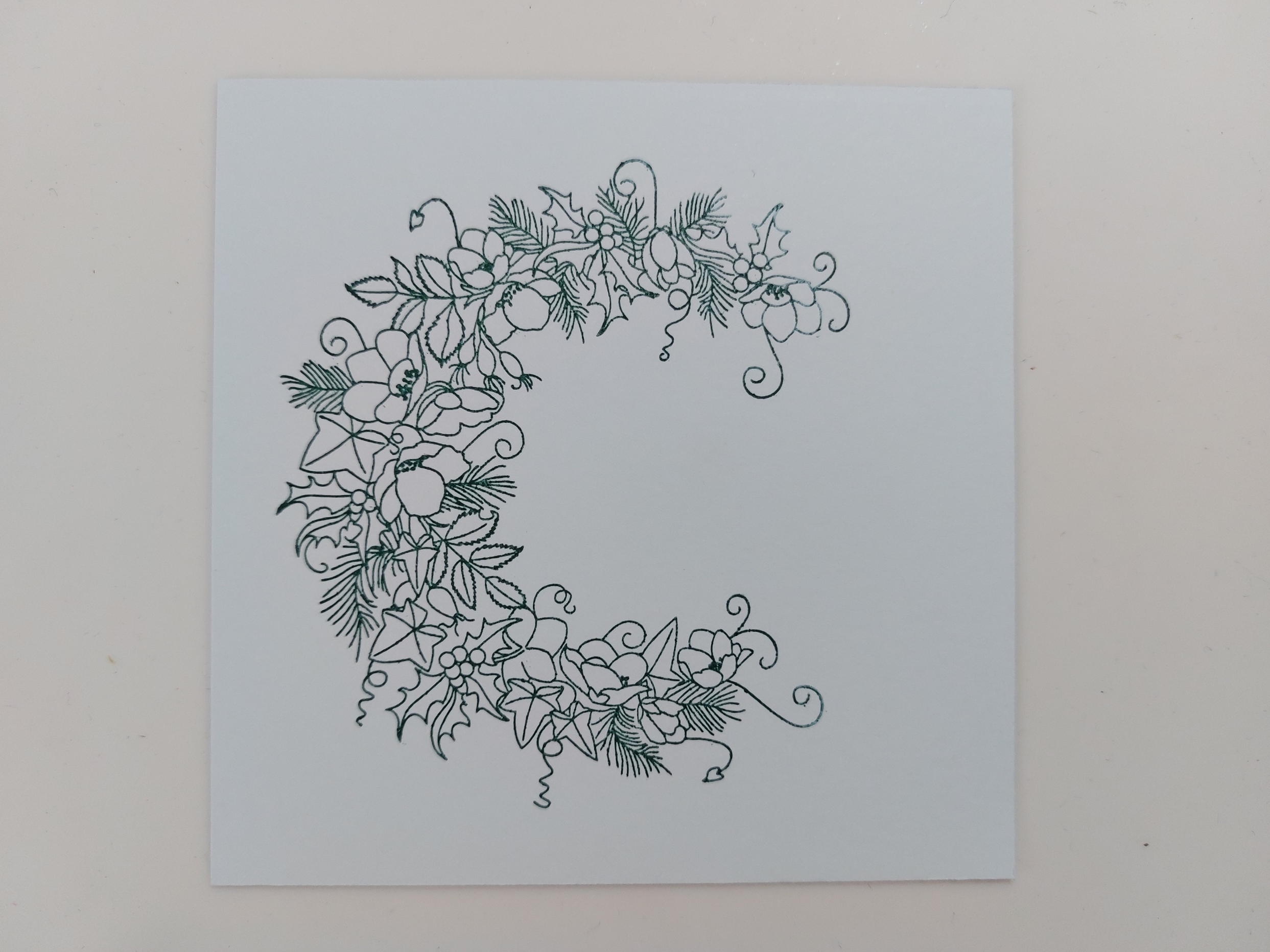 The first step was to stamp the wreath in ‘library green’ Archival ink onto a square of white card cut to fit 5×5 card blank. I then masked off the ‘C’ from the sentiment, inked it, removed the tape (key step!) and stamped it into the wreath.
