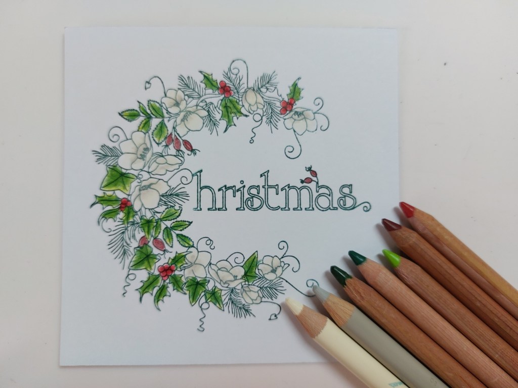 I coloured in the wreath using red & green Pergaliner pencils, with cream & warm grey Polychromos for the Christmas roses.