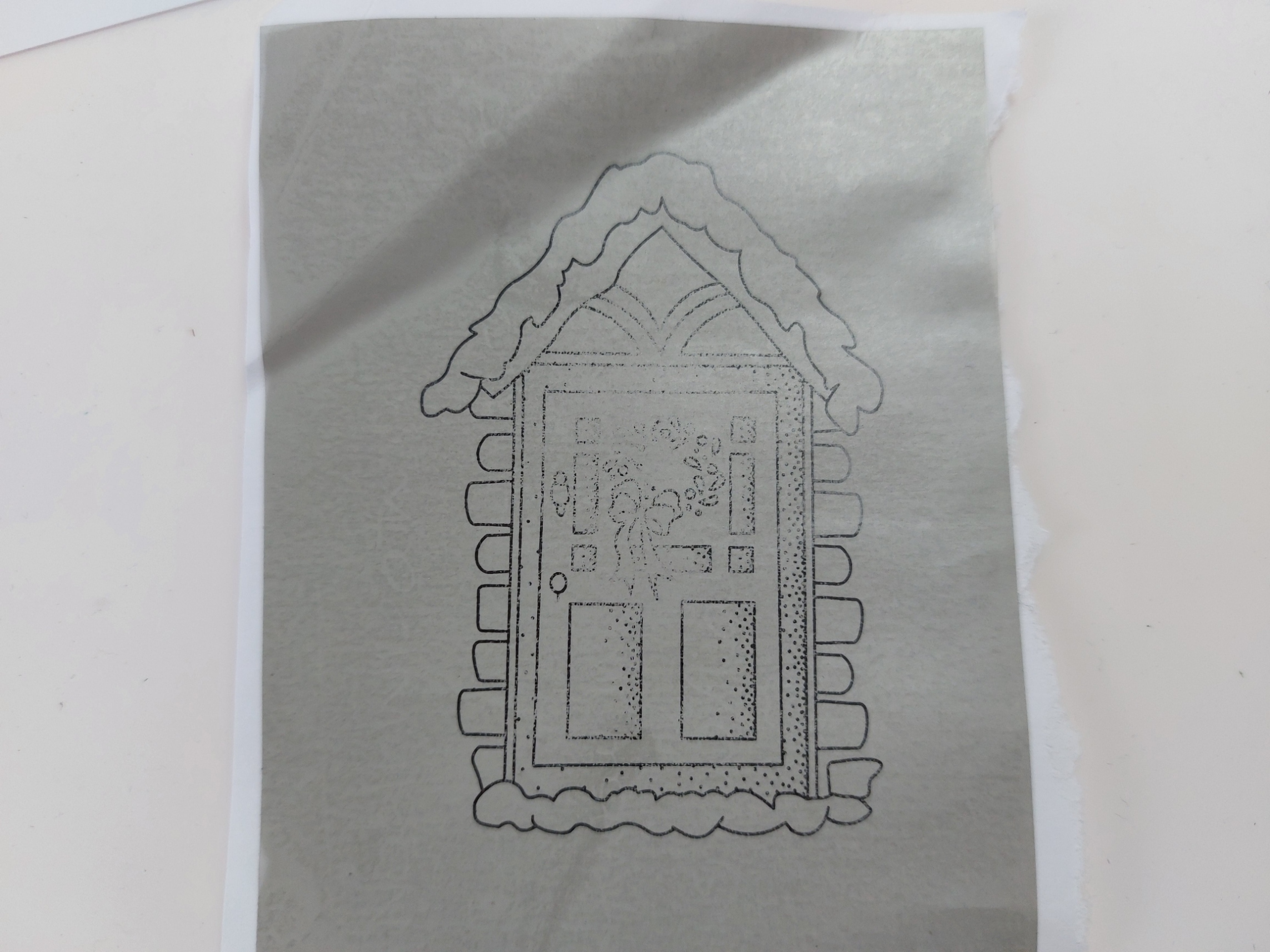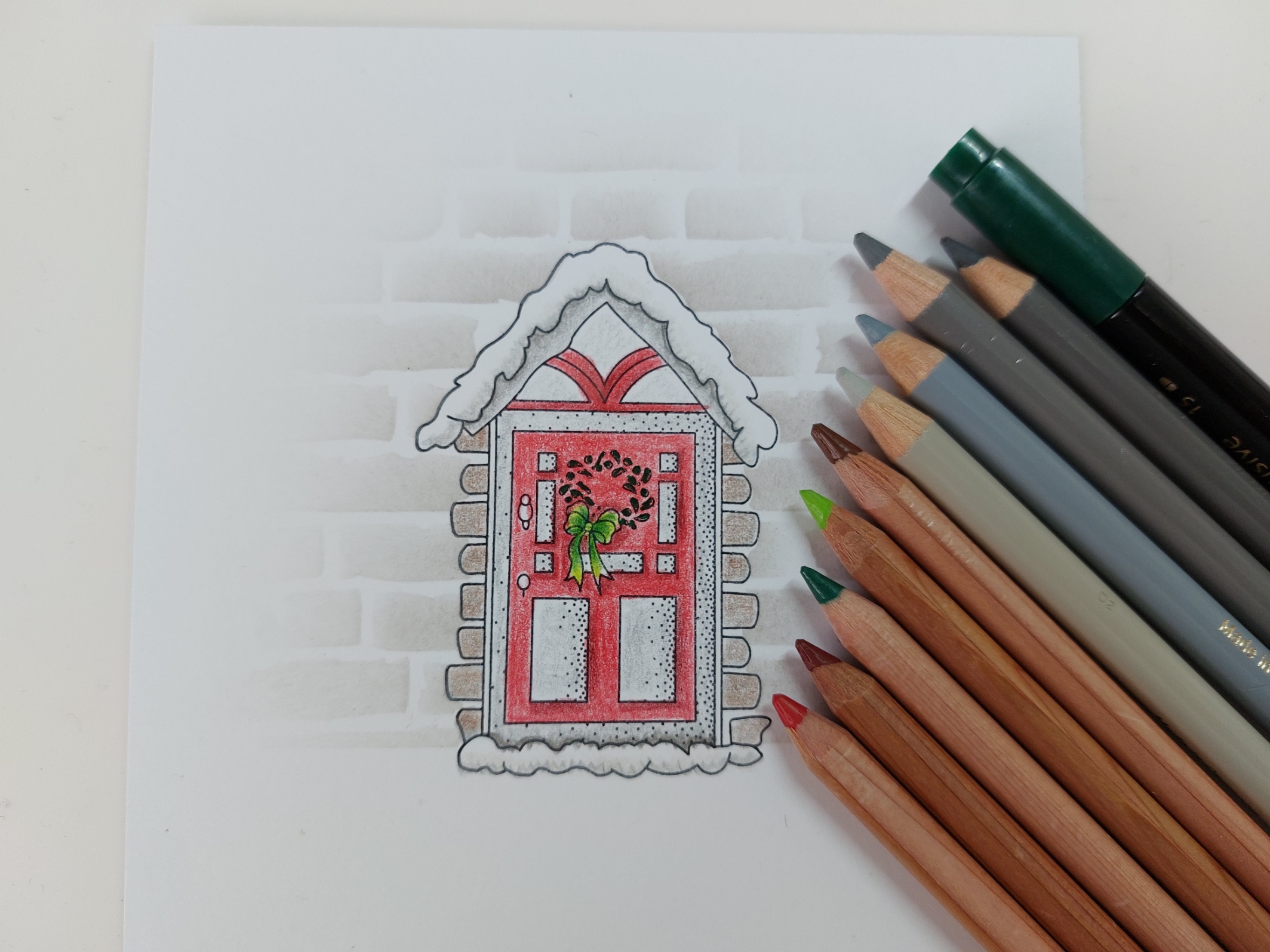 I removed the stencil, tape and mask and then set about colouring the image, using a mixture of Pergaliner and Polychromo pencils, finishing with a dark green Pergacolour pen for the leaves in the door wreath.