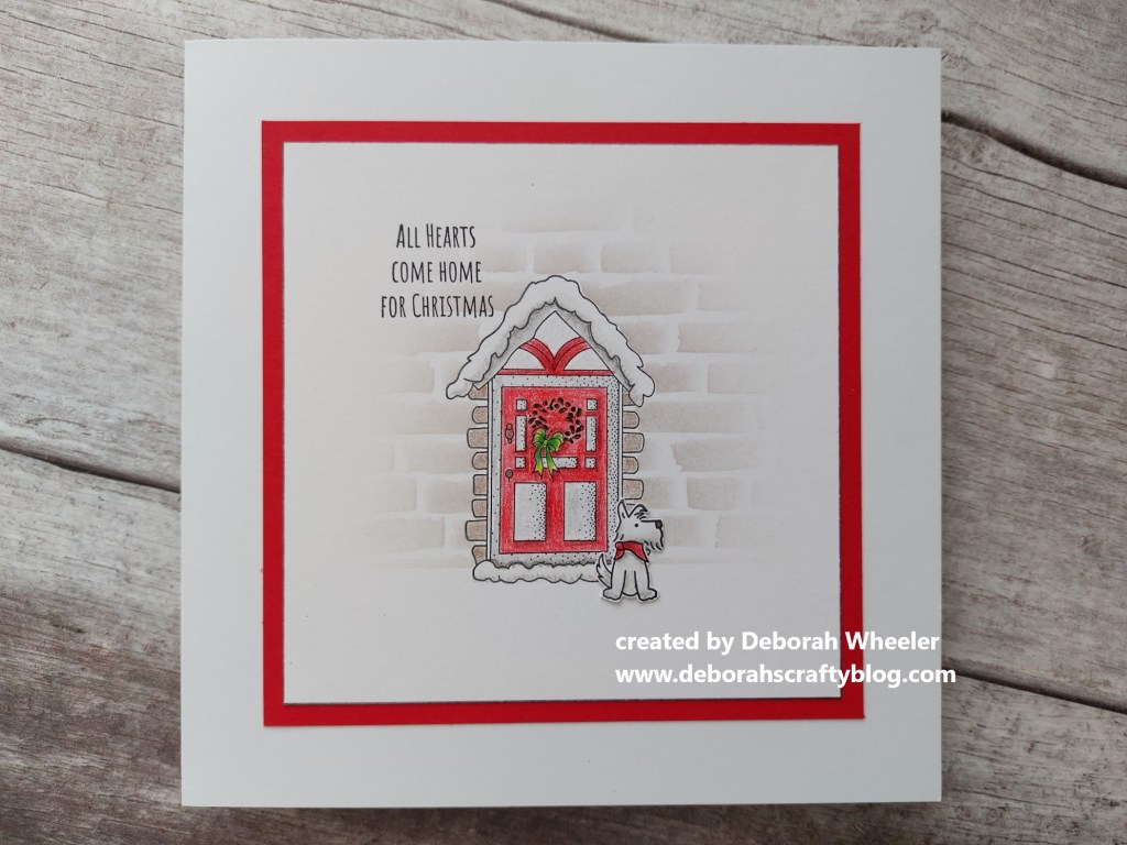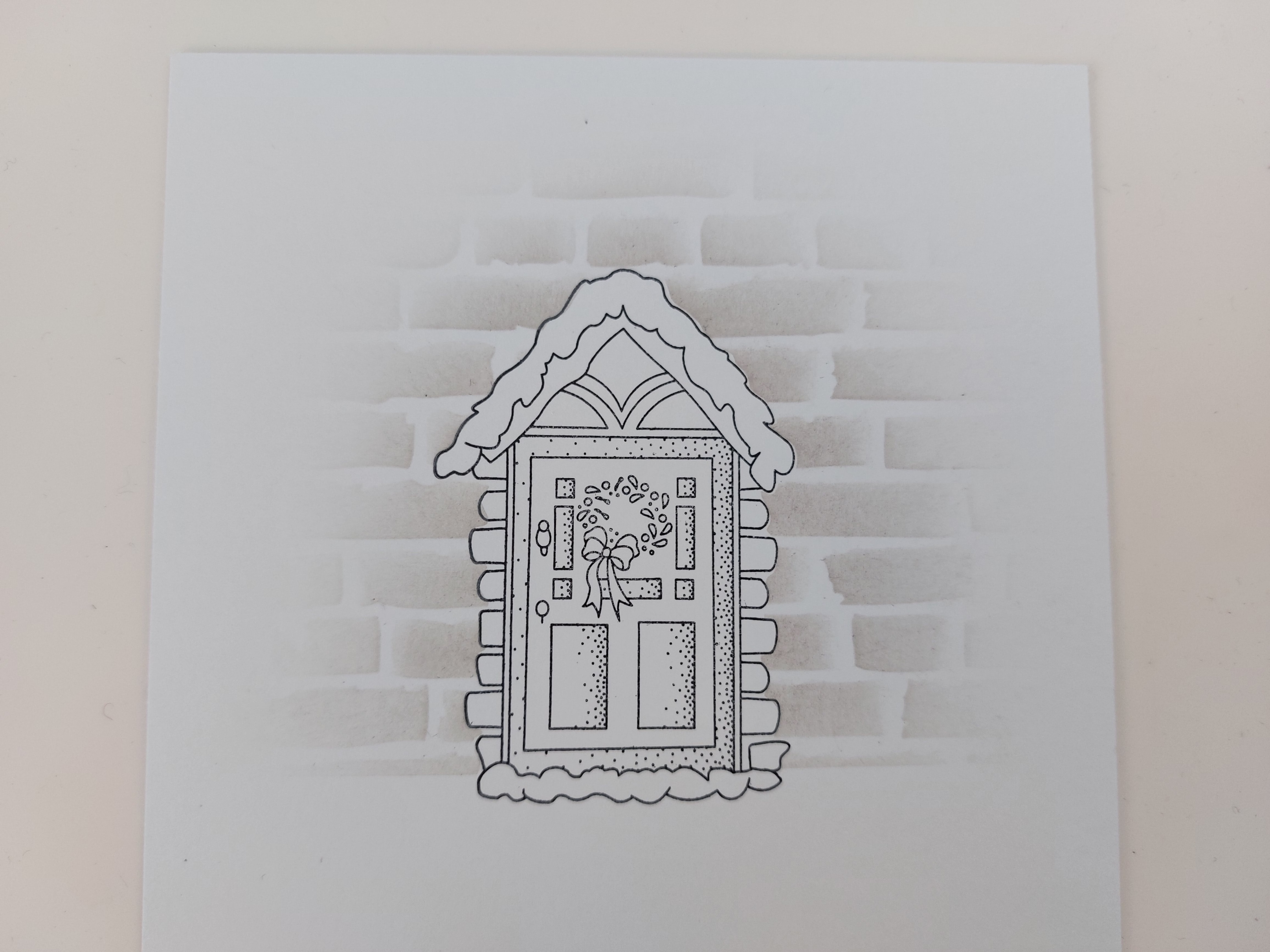 So, on to the card. I stamped the door image onto a square of square card, then masked it off, ran a strip of low tack tape along the bottom of the image and laid the ‘brick wall’ stencil over the top. I brushed ‘pumice stone’ Distress Oxide through the stencil, starting all the strokes from the centre and brushing outwards so the ink didn’t go all the way to the edge.