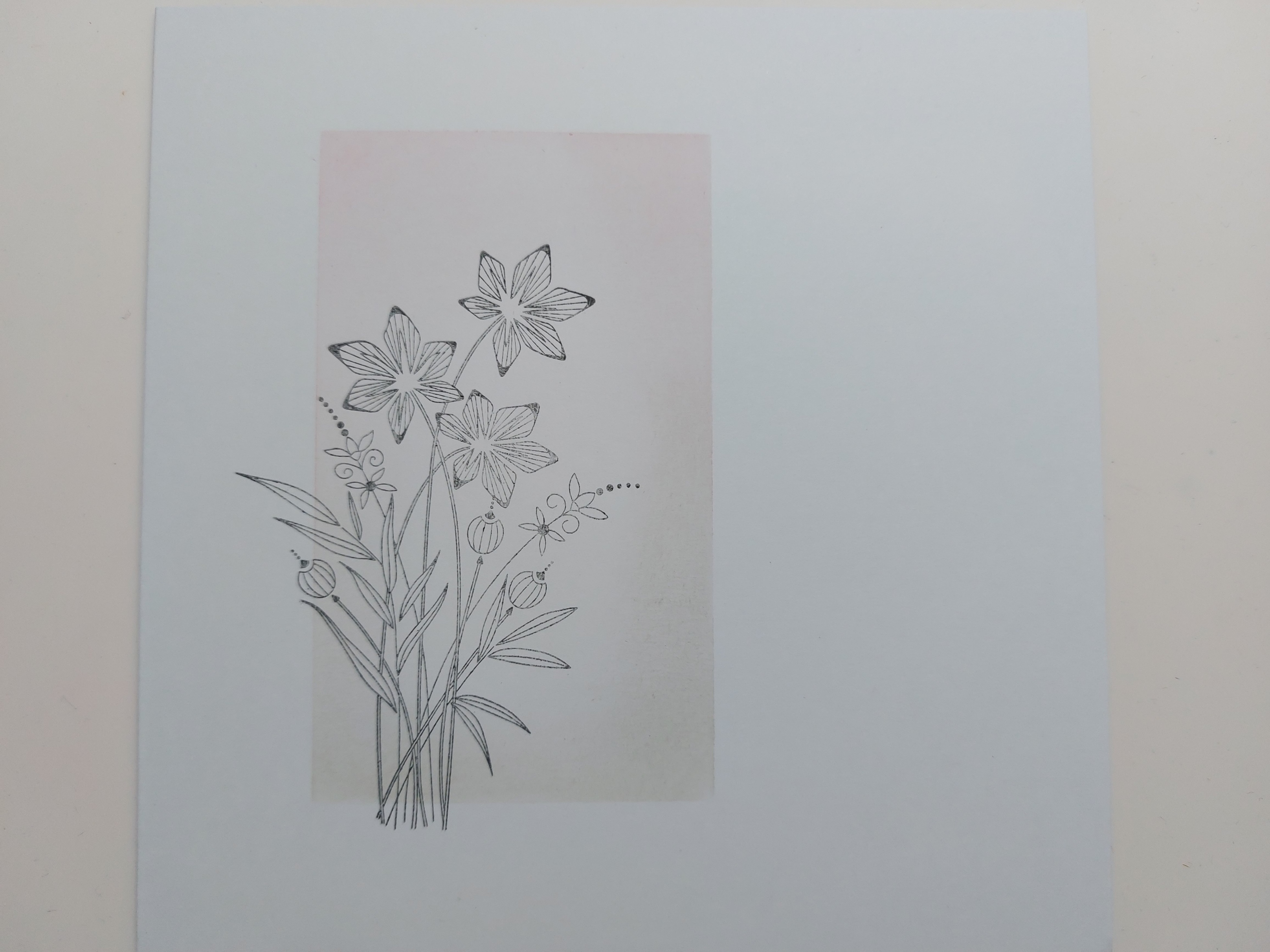 I started with the A4 rectangle panel stencil and used the second largest aperture on the front of a 6×6 card blank, brushing ‘pumice stone’ and ‘spun sugar’ Distress Oxides through it. I then stamped the star flowers onto the panel in ‘shadow grey’ Archival ink.