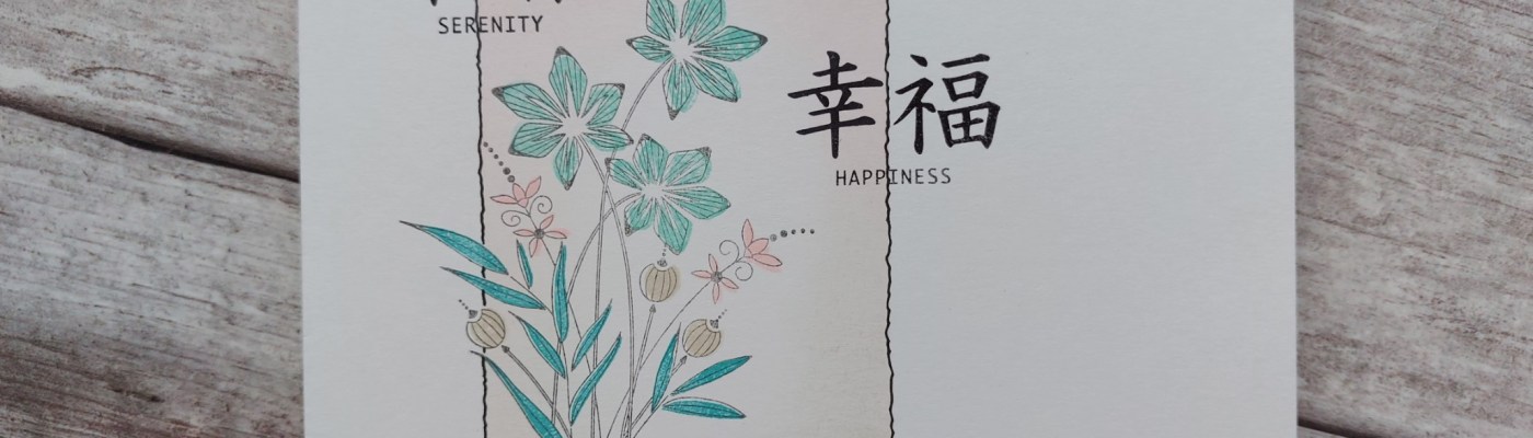 I drew a deckled edge around the inked panel with a micron pen and finished by adding three of the new small Japanese sentiments – I thought ‘serenity’ & ‘happiness’ sat well with the ‘zen’ sentiment, and these colours are also peaceful and calming.