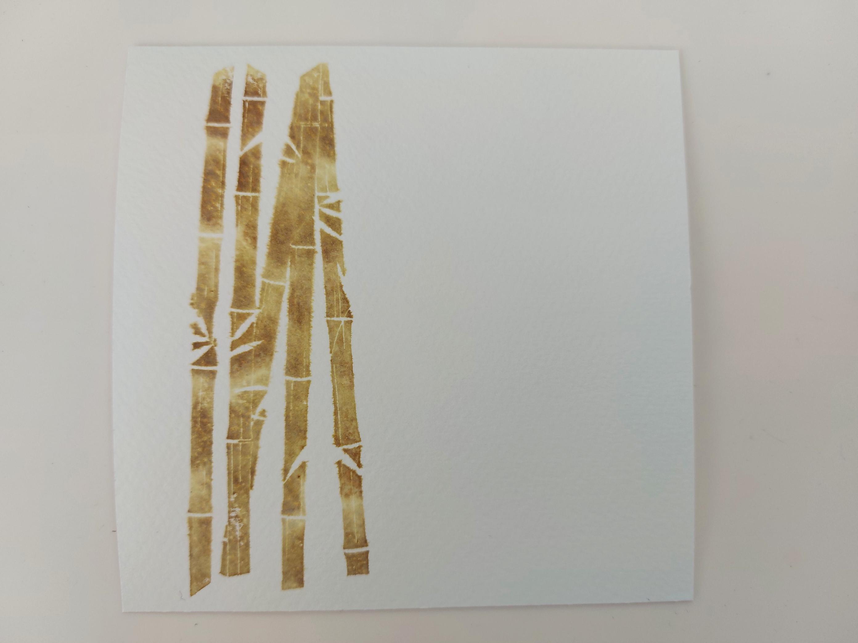 I started with a square of watercolour card, and put a wash of water on it. I then inked up the bamboo infill stamp, adding ‘antique linen’ and ‘walnut stain’ Distress Oxides with sponges, and stamped it onto the card. I really like the way the inks blend with the water to give a softer image. I then stamped the leaves into place with ‘peeled paint’.