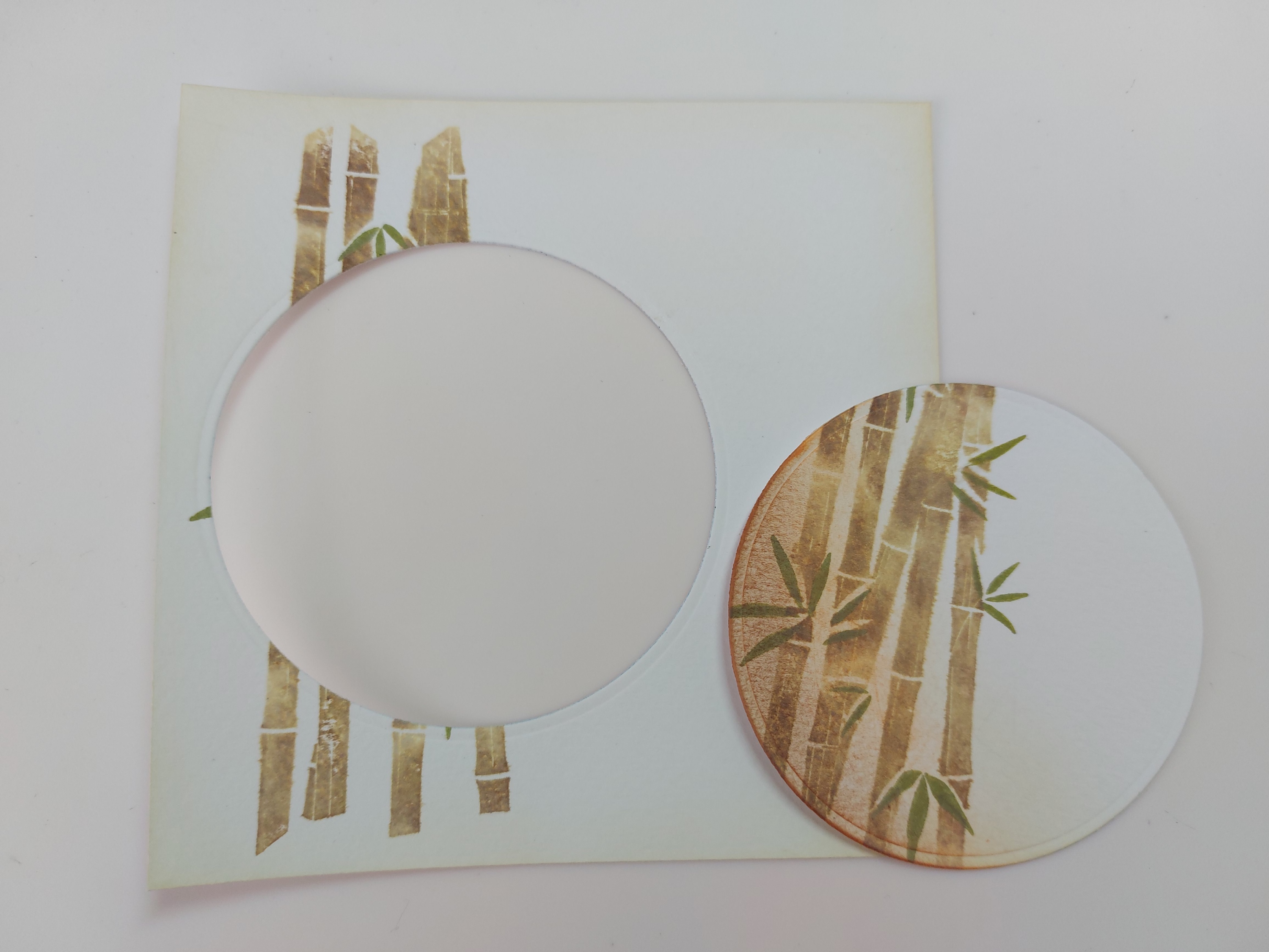 I added the ‘zen’ sentiment in ‘fern green’ Archival ink, then created a frame on the front of a 6×6 card blank with a square embedder and attached the topper.