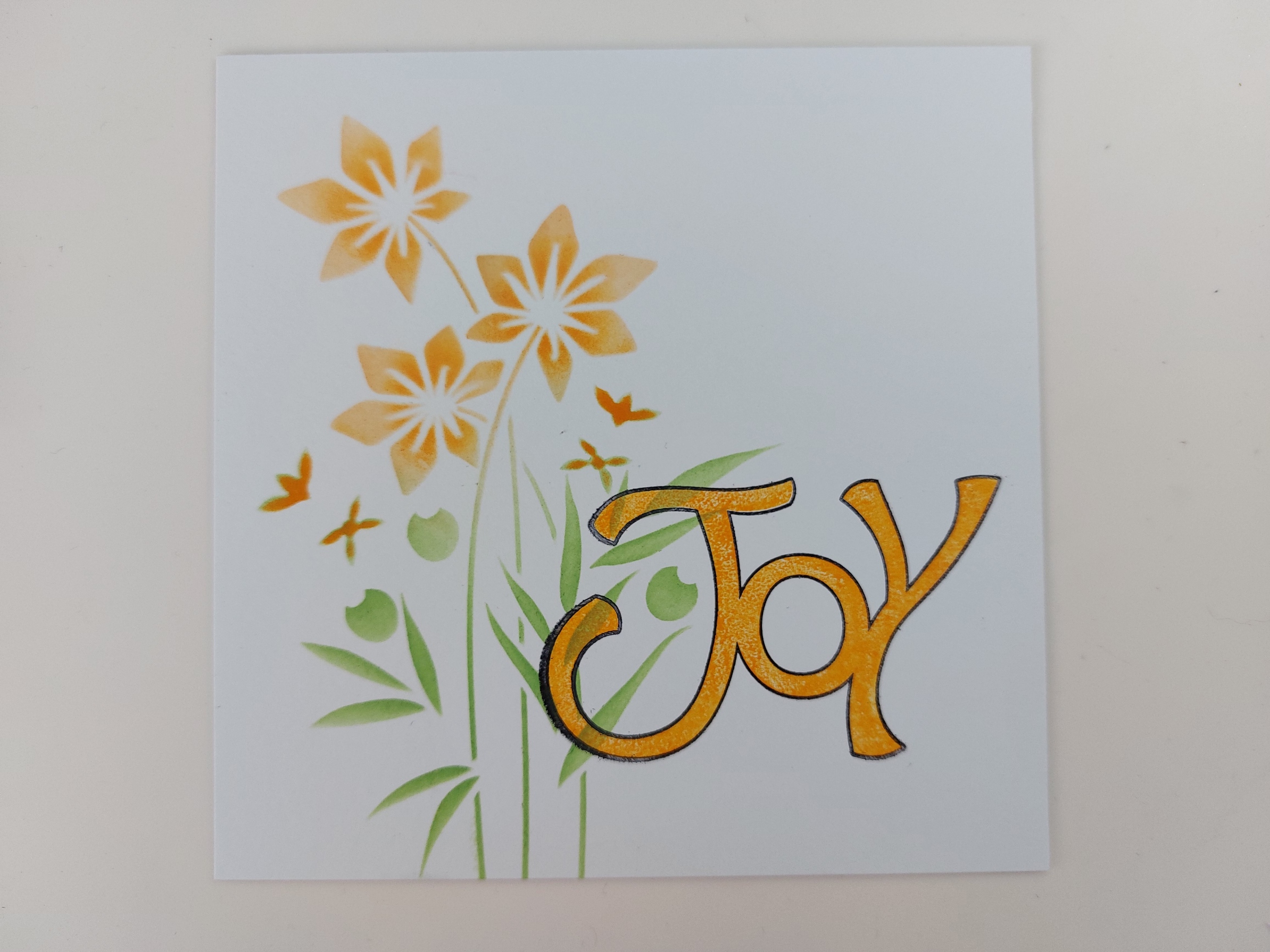 I started with the ‘star flower’ stencil on a square of white card and sponged ‘carved pumpkin’ and ‘rustic wilderness’ Distress Oxides through it. I stamped the ‘joy’ outline in black Archival ink and then added the infill stamp in ‘carved pumpkin’.