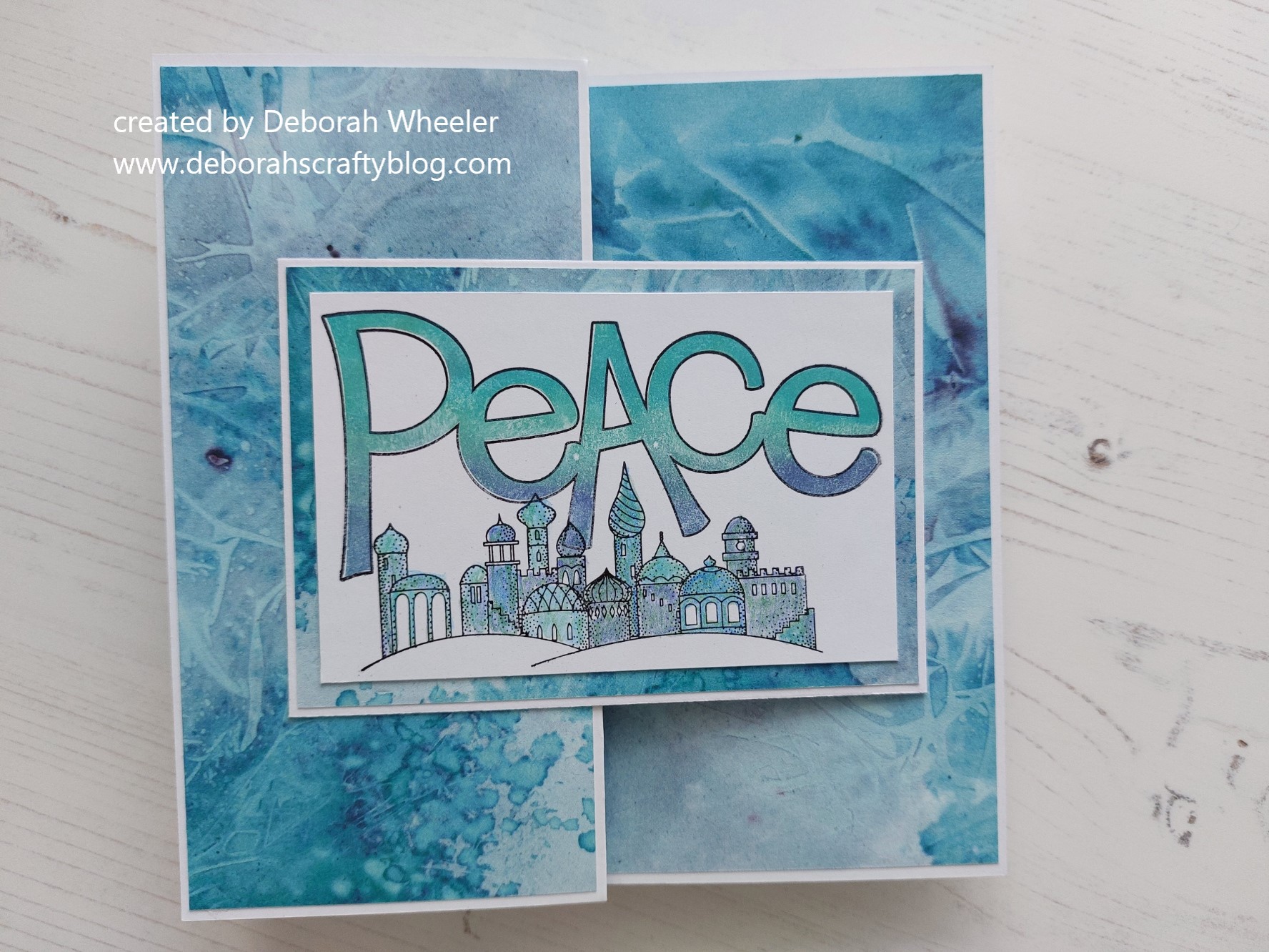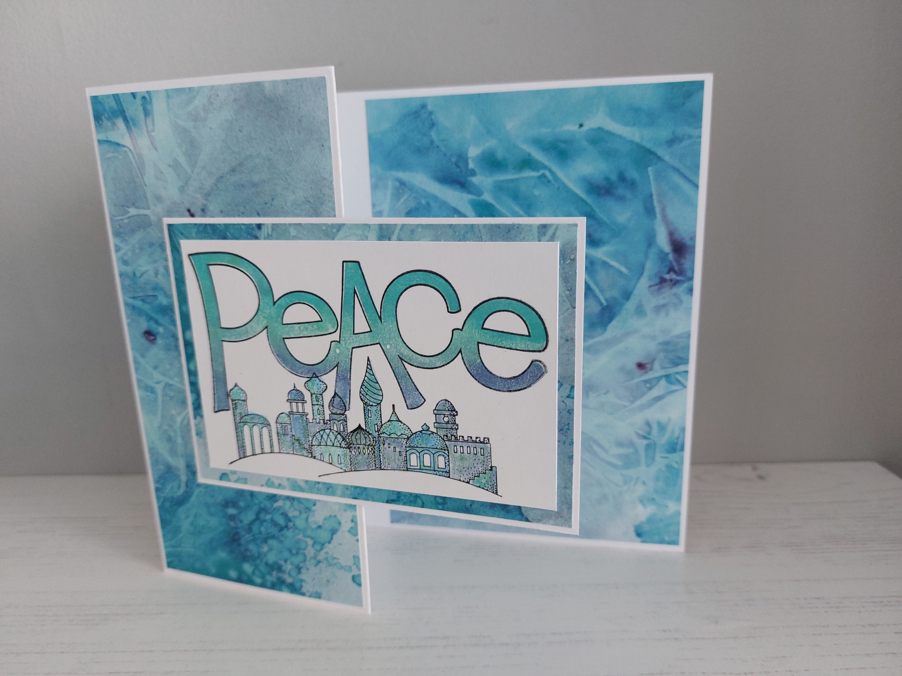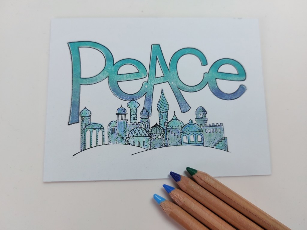 I then stamped the ‘peace’ word outline onto white card and added the buildings from the ‘Oh little town of Bethlehem’ stamp set. I sponged ‘chipped sapphire’, ‘evergeen bough’ and ‘peacock feathers’ Distress Oxides onto the infill stamp to colour in the word, before shading the buildings with Pergaliner pencils, blending the tones to match the background paper.