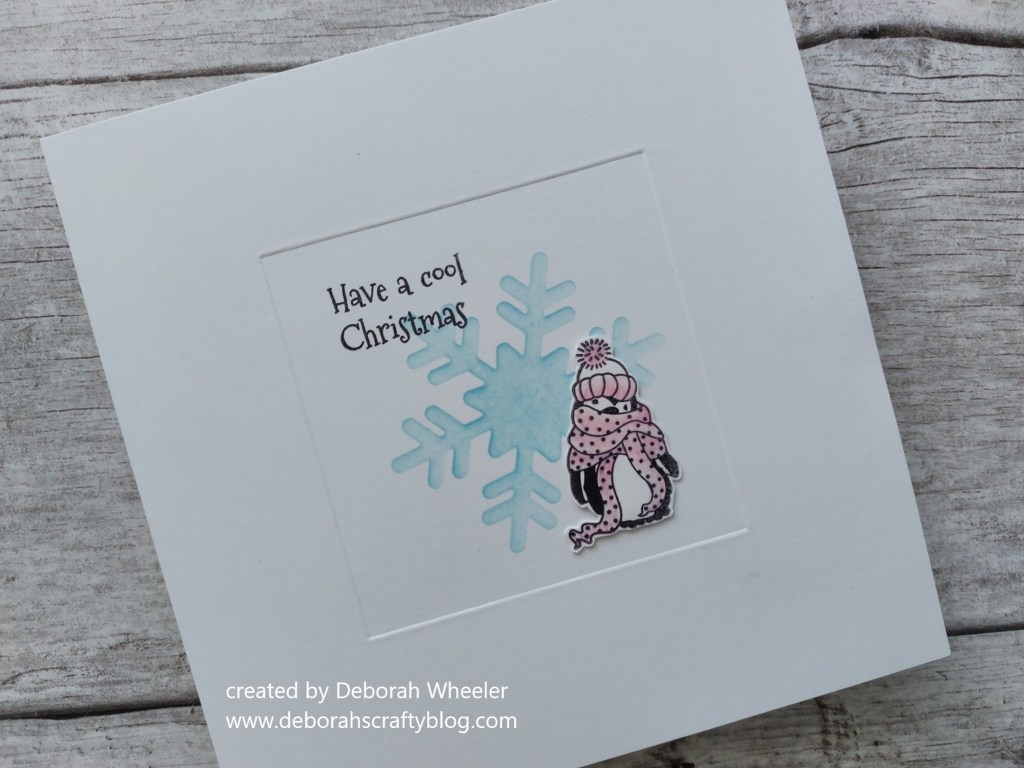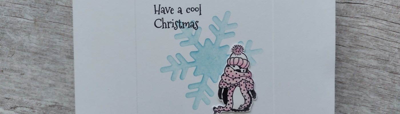 I stamped the little penguin onto a piece of scrap card using black Archival ink and shaded his hat & scarf using pink Pergaliner pencils I fussy cut him and attached to the card front with a small bit of scrap card glued on the back for a little more dimension, finishing with the sentiment from the stamp set.