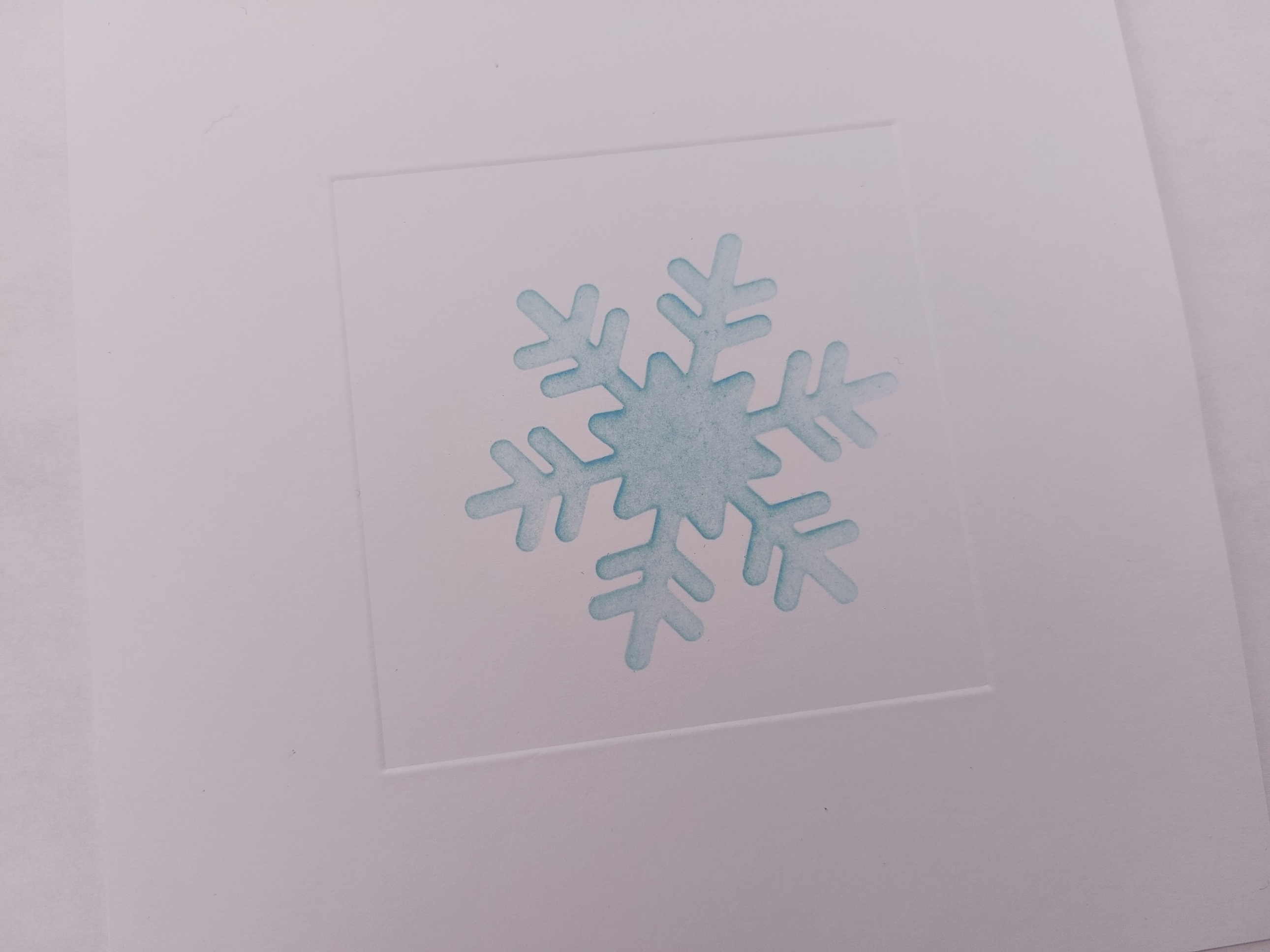 The first step was to create a frame on the front of a 6×6 card blank using one of Clarity’s square embedders. As a reminder, I just attached the plastic square to the card front using a bit of doubled over low tack tape, opened the card, located the edge of the square from inside the card using a bone folder and then sharpened the crease with a ball tool. I used the latest stencil from Clarity’s craft club, isolated one of the large snowflakes using low tack tape and brushed ‘broken china’ Distress Oxide across it.
