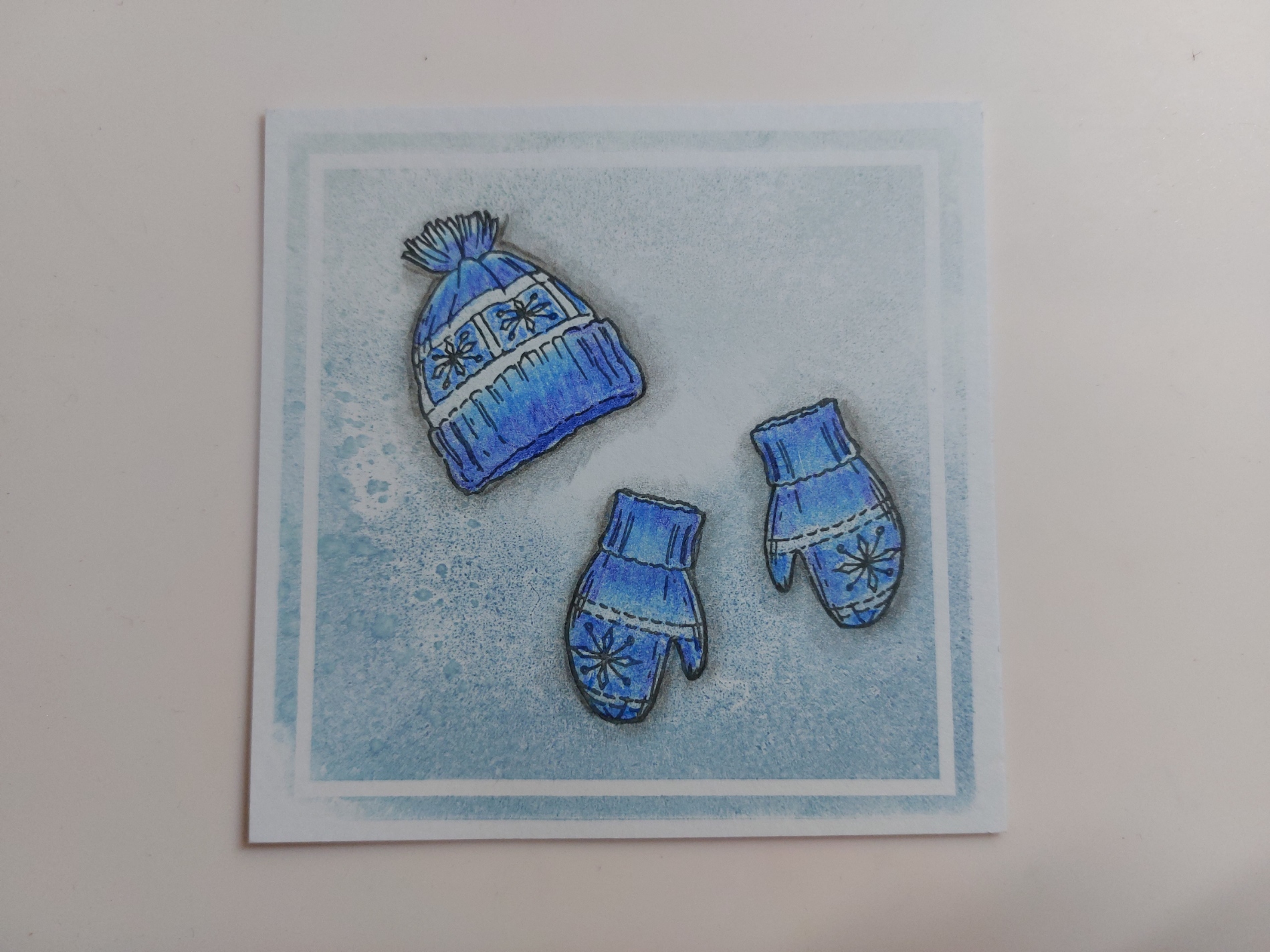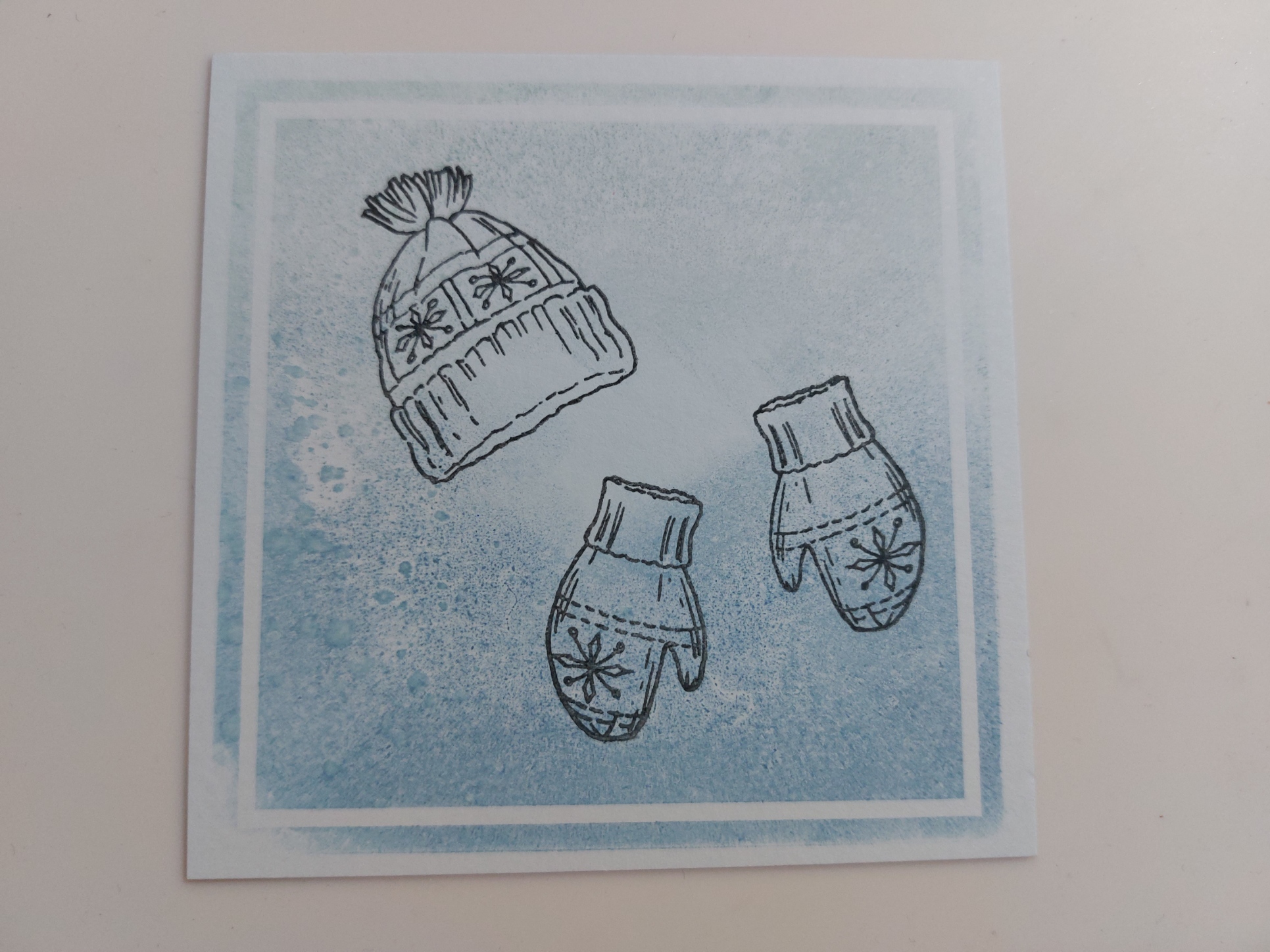 I started with the small square ‘backdrop’ stamp, inspired by a previous blog of Barbara Gray’s, sponging ‘speckled egg’ & ‘stormy sky’ Distress Oxides onto it, spritzing it with water and stamping it onto one of Clarity’s small square stencil cards. I then added the hat and mittens from the stamp set with ‘watering can’ Archival ink. Out then came my trusty Pergaliner pencils to shade them in, followed by grey Polychromos to create a drop shadow. I tried to leave the stripes on the hat and mittens white.